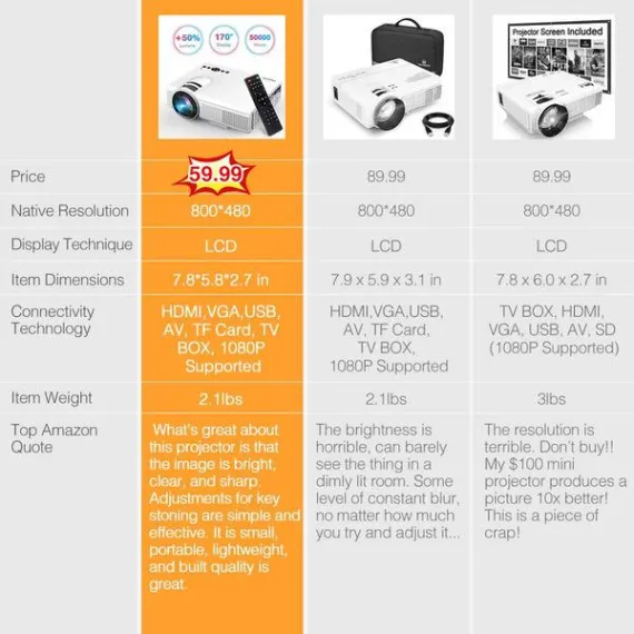 TENKER Upgrade Lumens Q5 Mini Projector, with Big Display LED Full HD Video Projector, Compatible with 1080p HDMI, Fire TV Stick, VGA, USB, AV for Home Theater Entertainment, Party and Games (White)