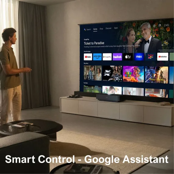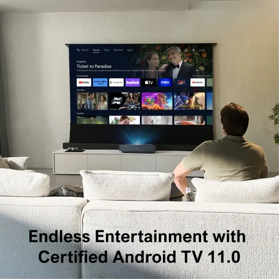 Thor T60 is a 4K ultra-short throw laser TV that delivers stunning visuals with 4000 ANSI lumens brightness, Dolby Vision, HDR10, and 120% BT.2020 color gamut. Its advanced triple laser engine ensures vivid, lifelike images even in bright rooms. With a 0.21:1 throw ratio, it projects a 100" screen from just 7.2 inches away. Features like Android TV, MEMC, ALLM low latency, 3D support, and built-in Google Assistant make it perfect for movies, gaming, and streaming-all in a sleek, quiet, and eye-protective design.