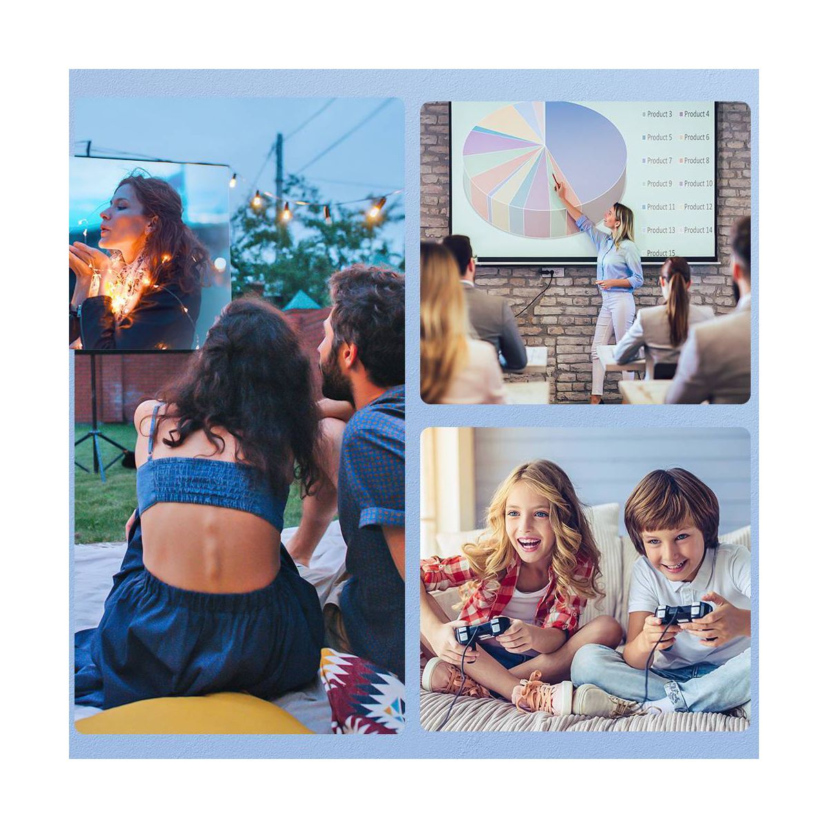Capable of expanding your viewing experience for extra depth and realism with multimedia connections, the 1080P video projector for home and outdoor provides flexibility to enjoy year-round entertainment. Using the remote to modify the screen is quite convenient, and it's also ideal for guiding the projector on the ceiling.