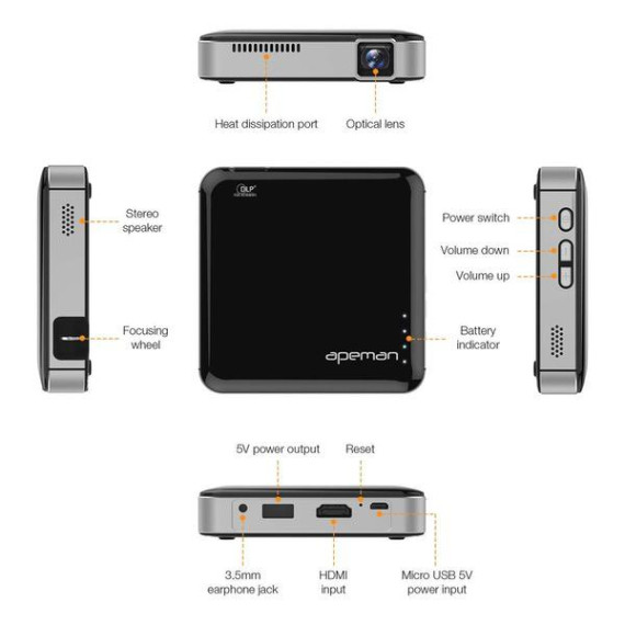 This well built and stylish little cutie comes in a nice gift box. It’s pocket size and weights 210g only. This is a real portable mini projector. With chargeable device, I don’t have to worry about connecting power supply cable. Frankly speaking, I don’t have high expectations on a DLP projector. But to my surprise, it provides high quality pictures. I project it onto my 70 inches wide screen. The image is sharp with bright colors and high contrast. Comparing with my 2400 lumens LED projector, I can’t tell big difference. But you know, DLP one is much smaller and lighter. The built in speaker is loud. It’s absolutely a great travel pal. It’s so easy to carry and setup. The most exciting thing is I can project to ceiling with mounting on tripod. Imagine how amazing it is, to watch a movie laying on your own bed! Love it.