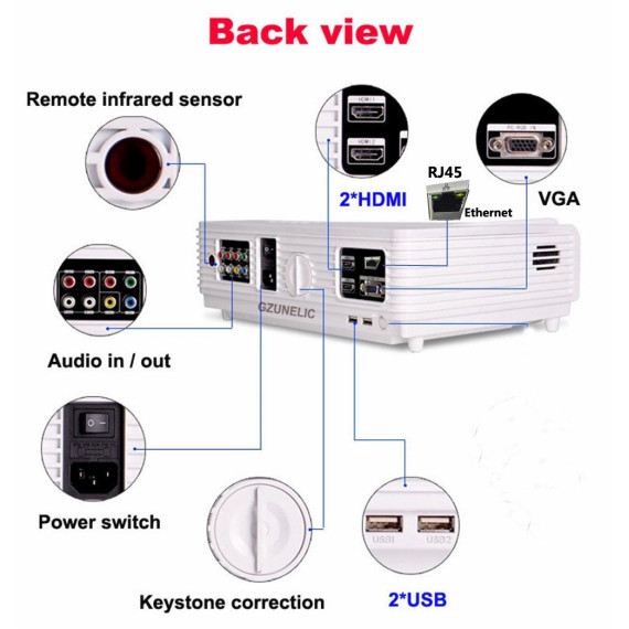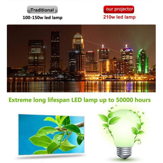 Make sure this fitsby entering your model number. 1.【Excellent Picture Quality Video Projector】: 4200 lumens led light utilization efficiency, 50% more than similar projectors, 210w high power US Cree lamp , 5 layers high transparency coated glasses lens instead of common resin one. 5.8 "TFT panel ,native 1280x800 support 1080p full hd, 2K 4K (limit no more than 100M bit rate,60HZ) 2.【Extremely Powerful LED Lamp and large-caliber optical lens 】 : 1080p Android projector with size 13*9.85*4.33 inch, weight 7.23 pounds. To take full advantage of the bigger projector internal room, we install high power 210w led lamp not common 100-150w. We equip large-caliber optical lens to enhance brightness. 3.【Unique "“Mirror”" System】: It is to wireless mirror all smartphones to projector by Airplay or Miracast. No need any setting, Just click on the “Mirror” icon on home page of android menu by remote, then you can enjoy large screen by phone 4.【Multiple Connections: Interfaces】:VGA/USB/HDMI/RJ45/AV/3.5mm Audio. Video led projector connect perfectly to PC / laptop / Set top box/ / DVD/ PS3 / PS4/ Xbox/ via HDMI input; connect headphone/outer speaker via Audio port; connect U-disk/ hard disk device via USB port;Remember switch to correct source when you switch using interface connect Ethernet cable via RJ-45 port; connect wifi signal directly; wireless connect bluetooth device ;wireless synchronize to phones by airplay or by Mircast 5.【US Repair Center in + 3-Years Warranty】: Leading after-sale service, The repair center is in LA,United States offer 3 years warranty. For Technical support, feel free to tell us your problem or questions.We will reply in 24 hours