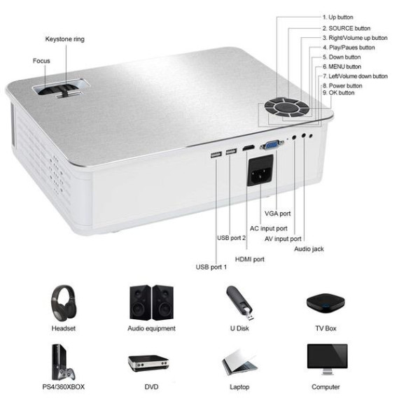 When I receive this projector , it is very impressive , the metal elegant design looks beautiful , and the package has HDMI /VGA/AV cables . I usually use it when I want to watch some special Sports Games or Some new exciting movies , I dont watch them with my Living room TV ,because it is just 50 inch screen , the bigger screen I want , but the bigger TV will be more expensive ,but the projector is ok ,although the brightness you can not expect too much ,but for the movies ,its enough. Hope everyone wants to feel the bigger screen exciting movies or Sports game .