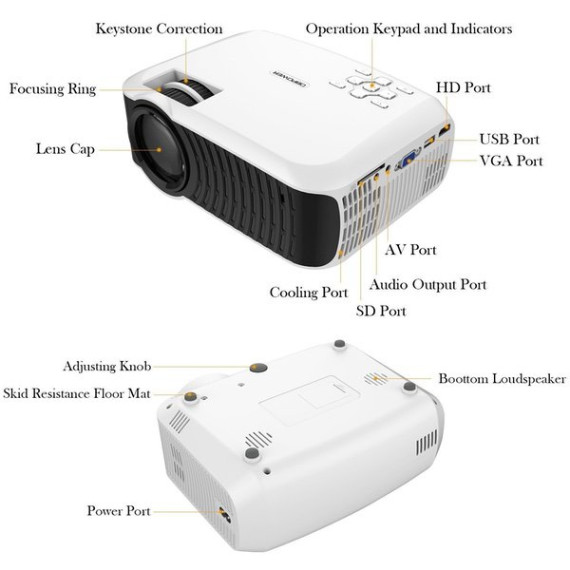 Make sure this fits by entering your model number. PROTABLE PROJECTOR WITH 120 ANSI FOR CLEARER AND SHARPER IMAGES - This mini projector with a contrast rate of 2000:1 and 120 ANSI is 80% brighter than most other projectors on market. 1080P resolution supported and new released LED source even make it perfect for home entertainment: watching movies, playing games, viewing photos etc. IMPROVED BUILT-IN SPEAKER AND FAN NOISE SUPPRESSION SYSTEM FOR FANTASTIC HOME THEATER EXPERIENCE- This projector is equipped with a newly released speaker system to make the sound 50% louder than traditional ones, meaning no external speaker is needed in normal sized rooms. As well as this, our R&D team has improved the fan design with an innovative cooling system that provides very efficient heat dispersion, which translates into less distraction when viewing movies or playing games. 50,000 HOURS FOR LONG LASTING LAMP LIFE - Adopted advanced LED lamp, this gadget offers extended lamp life more than 50,000 hours, your home theater projector's lamp should last over 32 years (4 hours a day, or less), so there is no need to replace the lamp. 32-176 INCHES / 1-5.2M FOR FLEXIBLE SCREEN SIZE EXPERIENCE - The mini home projector throw up 32-176 inches with projection distance 1-5.2m, which will provide a big-screen experience whether you're watching a movie or a football game. MULTIPLE INPUT INTERFACES FOR MULTIMEDIA CAMPTIBLE – This video projector is compatible with TV Box, Amazon Fire TV Stick, Chrome Book, PCs, laptops, tablets, Blue-ray DVD players, SD cards, USB flash drive, media players (Music, Pictures, Video, TXT), iPads, iPhones and Android Smartphones (External Wi-Fi dongle is needed to connect with smartphones).
