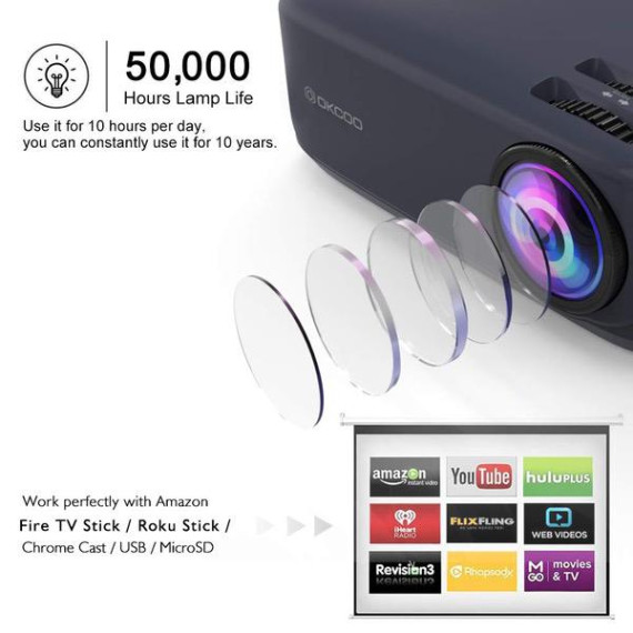 Make sure this fits by entering your model number. 【2019 UPGRADED TECHNOLOGY PROJECTOR】Bright 4500 Lux, 5000:1 contrast ratio, 50% brighter than other projectors. This video projector adopts the latest 3 LCD technology with advanced LED light sources. Sharp clear images but won't cause eyes strain and also great projectors for business ppt presentations 【MULTIMEDIA PROJECTOR】This business projector for laptop smartphone is equipped with multiple ports for ease of use, including HDMI, USB, TF Card, VGA, and AV interface. You can also connect this digital video projector to a TV stick directly, as well as game consoles, PCs, laptops, etc. To connect with smartphones and tablets, a separate adapter is needed 【AMAZING HD 1080P PROJECTOR】Support 1920*1080P full HD with 1280*800P native resolution. 32"-200" projection size with aspect ratio of 16:9/4:3. Best choice for families movie night at home or backyard in no light/low light environment. Enjoy the big screen movie time, and protect your eyes from TV, laptop and smartphones 【MORE FUN WITH A PROJECTOR】This projector is more than a home cinema movie projector and a business presentation projector, it can be used to project interesting images like setting continuous theme looping at your bedroopm or parties, wall mural by Projecting the desired image on your wall, etc 【CONVENINENT OPERATION】This home and office projector has great built-in speakers system, offering excellent loud sound quality. Advantaged cooling system enhances heat dissipation with less noise. Easy to adjust focus and make keystone correction. Come with remote controller. You can chill on sofa changing audio, choosing sources without standing up
