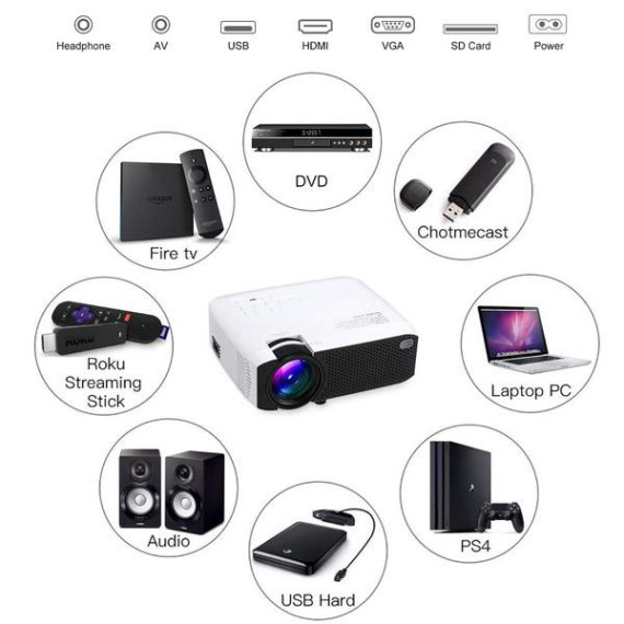 - 【Supports Multiple Media Inputs】The compact video projector is easy to set up and operate with many ports, including HDMI, VGA, USB, Micro SD, AV interface,headphone. It supports wide-range multimedia connection with many devices. Connect PC/Laptop/ Android TV Box via HDMI or VGA port, connect Chrome Cast/Fire Stick via HDMI&USB ports, connect DVD/Cable Box via AV port, Connect PS3 PS4 or X-Box ONE Wii via HDMI cable to enjoy games on so big screen!