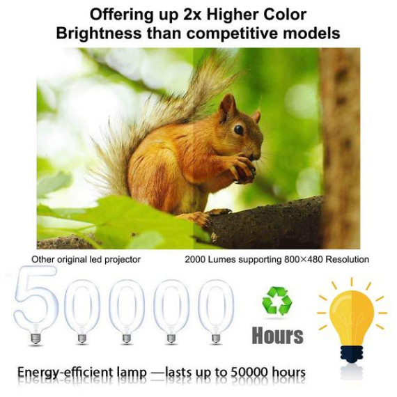 - 【Low noise & Energy efficient】This upgraded projector is lower in noise and more durable than previous models thanks to advanced fan cooling technology. The projector has the best cooling system ,high cooling efficiency and low fans noise, extending the bulb life to 50,000 hours, which means you can use it more than 5 years, giving you the superior audio-visual experience continuously.