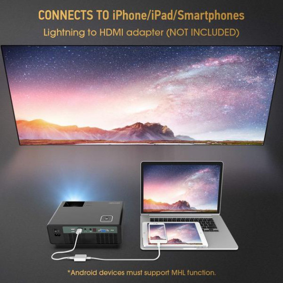 Make sure this fitsby entering your model number. BRIGHTER & SHARPER: This Mini Projector features 27 color-enhancing technologies, which bring you a 50% brighter and sharper image than other mini projectors on the market. Not recommend for PPT or business presentation. SUPERIOR HOME CINEMA EXPERIENCE: Our portable projector adopts a contrast ratio of 2000:1 and 16:9 aspect ratio, and supports for 1920x1080 resolution.It provides a watching size from 32” -176” with the projection distance between 1.5-5M. A projection distance about 2M is the recommended viewing distance. LOWER NOISE: Upgraded cooling system prevents overheating itself for a longer and better performance and reducing fan noise, to give you a more immersive, authentically-reproduced audio experience. MULTIMEDIA VERSATILITY: This Home Movie Projector can be connected to HDMI/AV/VGA/USB, which allows you to use it with laptops/PCs/TV Box/Amazon Fire TV Stick/Chrome Book/Tablets/Blue-ray DVD players/USB flash drives/media players/Smartphone (Wireless HDMI dongle NOT included). 3-YEAR WARRANTY (100% MONEY BACK GUARANTEE): We offer our customers a 3-year 100% Money Back Guarantee and professional customer service & technical support. Please feel free to contact us if you have any problems.