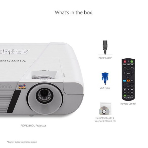 • INCLUDED IN THE BOX: PJD7828HDL 1080p Projector, Power Cable, Cable Management Cover, and Remote Control