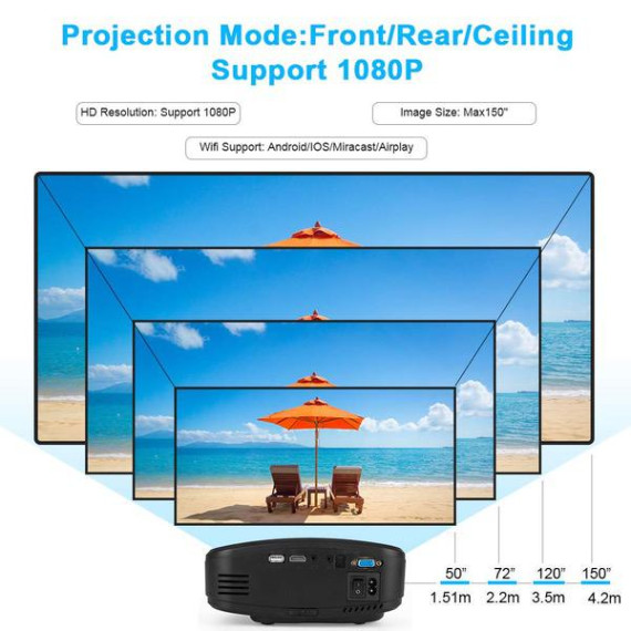 Make sure this fitsby entering your model number. 2019 UPGRADED Wireless WiFi Video Projector: our Mini Video Projector can project directly from your smartphones through wifi, no need to buy other Wireless dongles, or download any apps, you can enjoy big screen instantly with your phone through wireless display without cables. +50% UPGRADED BRIGHTER AND CLEARER IMAGES: Support Full HD1080P/720P High Resolution; 800x480P Native Resolutions; 1200:1 dynamic contrast ratio for rich detail in different scenes , more brighter than ordinary led projectors. UPGRADED LARGE SCREEN FOR AMAZING VISUAL FEAST: The WiFi Theater Projector support 40~130 inches ( Best for 84” ). Projection size with 2.0~4.0 meters projection distance, which provide outstanding Big Screen Experience for Home Entertainment like watching movies, playing games in dark environment. MULTI-INTERFACE FOR UNIVERSAL DEVICES: Built- in with VGA/AV/USB/HDMI interface, it can connect with multiple devices.Our Portable Movie Projector enable to connect to your iOS/Android phone or other devices like DVD Player/ PS3/ WII /Xbox/ TV box / PC / Laptop 3-YEAR WARRANTY ( 100% MONEY BACK GUARANTEE ): We offer our customers a 3-year 100% Money Back Guarantee and professional customer service & technical support,If your projector has any quality issues, please contact our customer service immediately. We will definitely help you solve it.