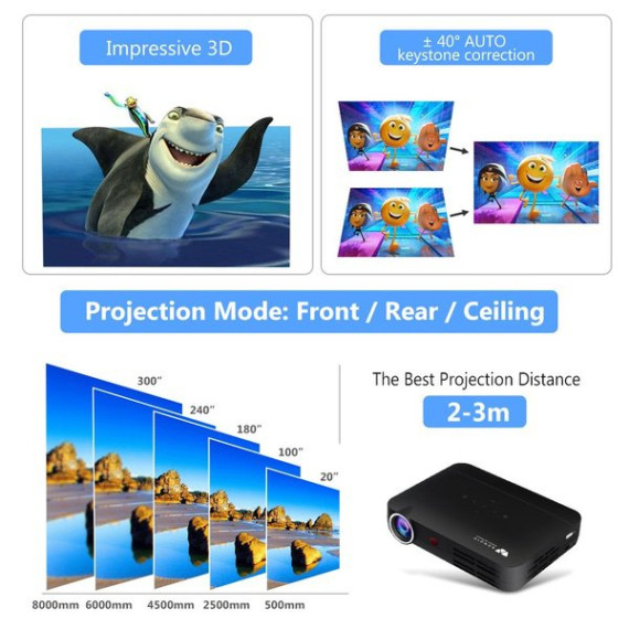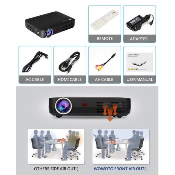Make sure this fitsby entering your model number. ★Advanced Configuration★ 1280*800 native resolution (WXGA), 3500 Lumens, Android OS, DLP technology, LED Lamp. Amazing 3D effect, supports 1080P input. Built-in Wi-Fi/Bluetooth/Speaker/Touch Control. Extensive Stable Wired Connection: HDMI*1, AV*1, USB2. 0*1, USB3. 0*1, Micro SD*1, RJ45*1 ★ ★Best Choice of Projector★ You can download and install apps you like and play it on the huge projection screen (up to 300”) Also can connect external speaker to enjoy music! Rich color and HD resolution provide the great visual feast. ★★★Update: The batteries for remote control won't be included in the package, because we're informed that shipping AAA batteries is dangerous. Please buy the AAA batteries separately. Thanks for your understanding. ★★★ ★Wireless Screen Share★ Smartphone resources can be shared through the huge screen by Airplay/Miracast/DLNA/Share. Project from your laptop, tablet, or smartphone without plugging into the projector, so you can move freely about the room, your business life will be convenient and professional. ★Compact Stylish Design★ Popular matte black brings stylish body. First Choice of Christmas gift. No larger than an iPad mini, lightweight only 0. 5kg. Easy to set up and enjoy with whole family right away! Touch Control is displayed on the top. Connect wired/wireless mouse to USB port or Bluetooth. When not in use, won’t take up much space. ★ and Service★ 20, 000 hours Long-lasting LED lamp does not have to be replaced for 7 years even if the projector is used 7-8 hours every day. Every DLP Projector from WOWOTO enjoys Full 12 months . WOWOTO professional after-sales team will response your any problems within 24 hours. ★Customer Service Available Before/On/After Christmas Day. ★