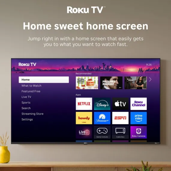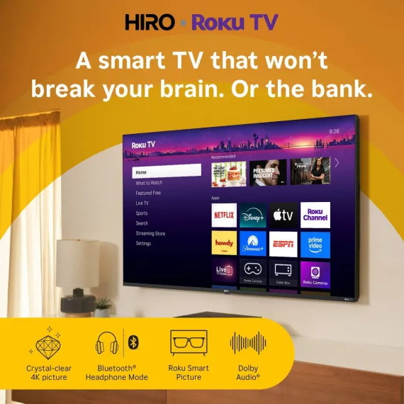 Say hello to Hiro— the smart TV that saves you from overpriced, overcomplicated tech. It delivers unbeatable value, reliability, and Roku—America’s #1 streaming experience. This flat screen TV’s 4K display creates crystal-clear picture, while the speakers produce rich sound—you can even pair your TV with Bluetooth headphones for private wireless listening. The Roku experience keeps streaming simple with a customizable home screen, more than 500 free channels with live television, automatic updates, and more. It’s the perfect TV for bedrooms, dorm rooms, living rooms, and kids’ rooms. Hiro makes TV effortless, so you can spend less time figuring it out and more time enjoying it.