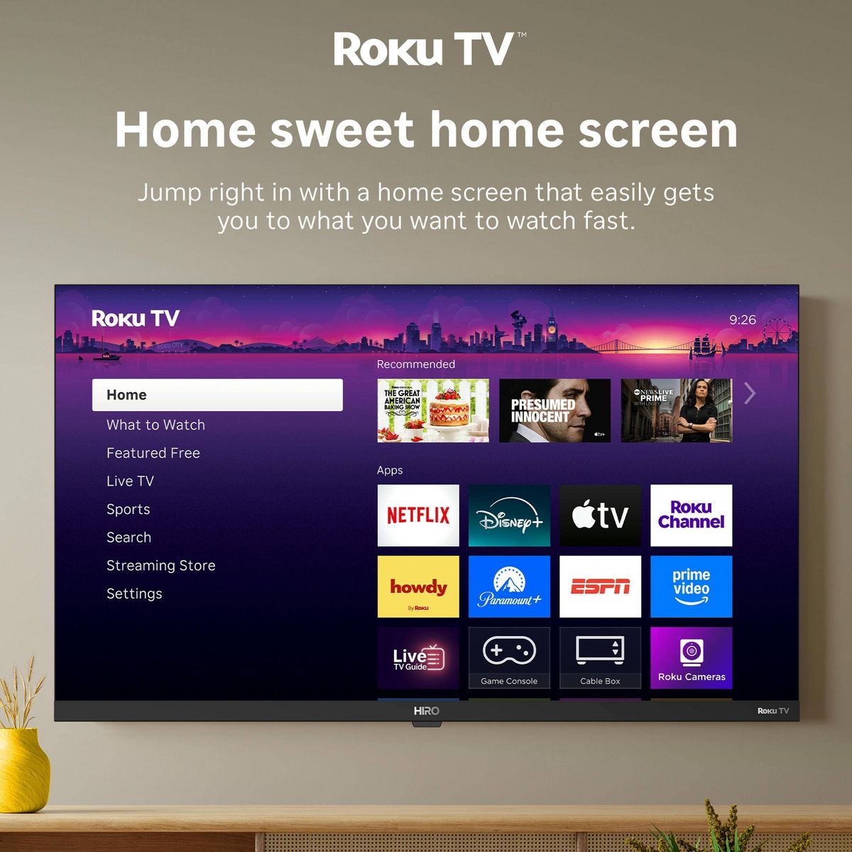 Say hello to Hiro— the smart TV that saves you from overpriced, overcomplicated tech. It delivers unbeatable value, reliability, and Roku—America’s #1 streaming experience. This flat screen TV’s HD display creates bright, sharp picture, while the speakers produce rich sound—you can even pair your TV with Bluetooth headphones for private wireless listening. The Roku experience keeps streaming simple with a customizable home screen, more than 500 free channels with live television, automatic updates, and more. It’s the perfect TV for bedrooms, dorm rooms, living rooms, and kids’ rooms. Hiro makes TV effortless, so you can spend less time figuring it out and more time enjoying it.