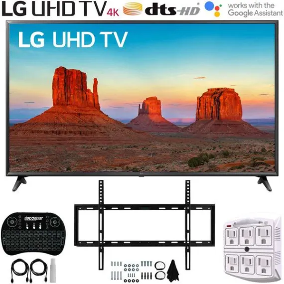 LG 43UK6090PUA 43" 4K HDR Smart LED UHD TV + Slim Flat Wall Mount Ultimate Bundle + 2.4GHz Wireless Keyboard Smart Remote w/Touchpad Mouse + SurgePro 6-Outlet Surge Adapter w/Night Light