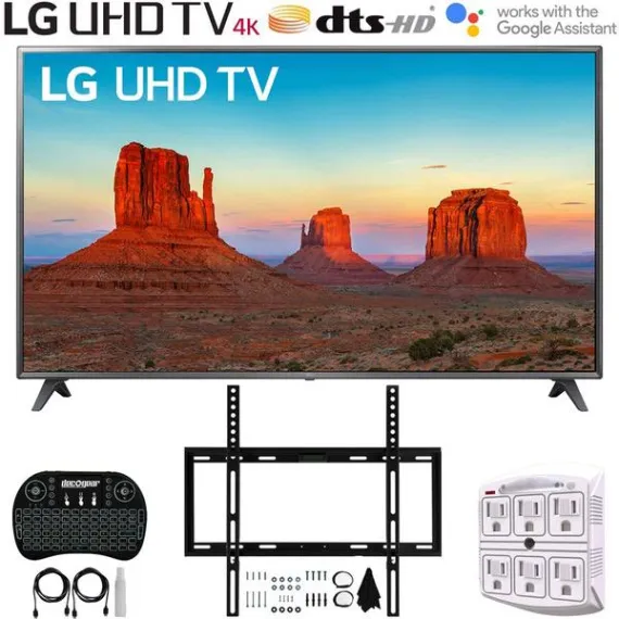 LG 75UK6190PUB 75" 4K HDR Smart LED UHD TV (2018) + Deco Mount Flat Wall Mount Ultimate Bundle + 2.4GHz Wireless Keyboard Smart Remote w/Touchpad Mouse + SurgePro 6-Outlet Surge Adapter w/Night Light