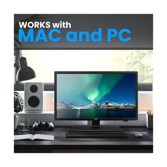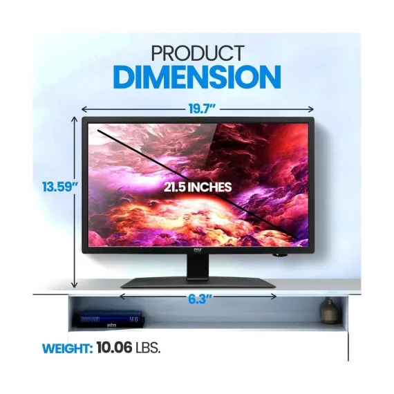 The Pyle 21.5'' ELED RV Digital TV is a versatile entertainment solution perfect for RVs, campers, and mobile setups. This Full HD 1080p flat screen TV features a built-in DVD player, allowing you to enjoy your favorite movies on the go. With multiple input options, including HDMI, VGA, RCA, and composite, you can easily connect various devices for a customized viewing experience. The TV is also compatible with both Mac and PC, making it ideal for a wide range of uses. Whether mounted on the wall or using the included stand, this TV offers crisp visuals, clear sound, and flexible functionality, making it a must-have for any road trip or outdoor adventure.
