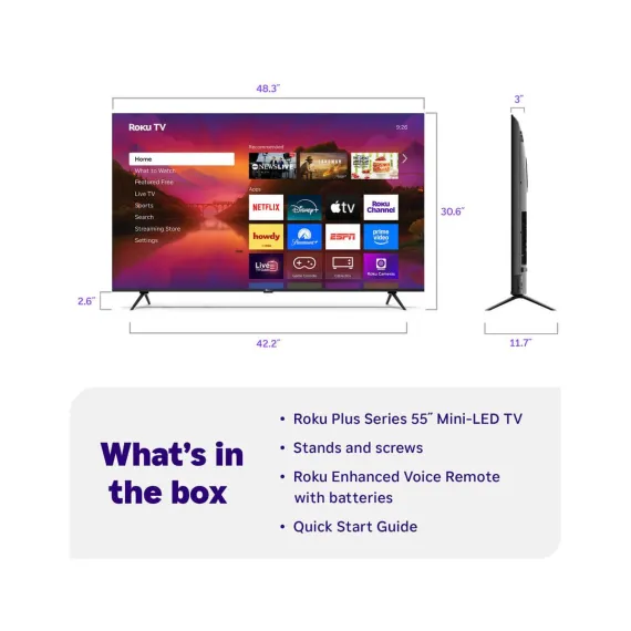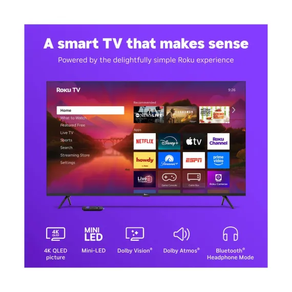 A smart TV that makes sense. Roku Plus Series TVs are designed for a premium experience. Accurate colors pop off the QLED television screen with Dolby Vision technology. Launch your streaming favorites lightning quick on this flat screen TVin brilliant 4K. Catch every word with auto speech clarity and night mode or pair wireless headphones so you dont wake the house. Find entertainment in a snap with the remotes hands-free voice controls. Smart TV doesnt have to be complicated.Thats why weve designed a line of flat screen smart TVs powered by the delightfully simple Roku experience. Breathtaking Picture
