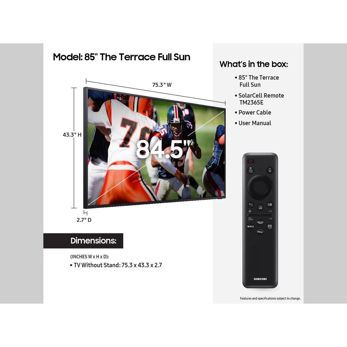 Forget curb appeal. With The Terrace, it’s all about the backyard. The 85” brings brightness and picture quality to your pool parties and game day group hangs. Impress your neighbors with our largest outdoor TV that has our highest IP rating for durability* and protection against water and dust so your oasis stays looking awesome all year long. *IP56 rated for dust and water.
