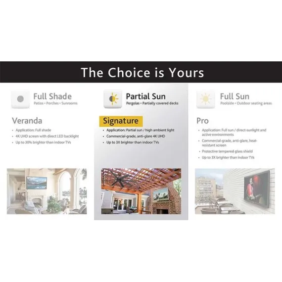 - Weatherproof 65-inch outdoor television - SunBrite Signature Series for partial-sun and high ambient light applications such as patio, deck, yard.