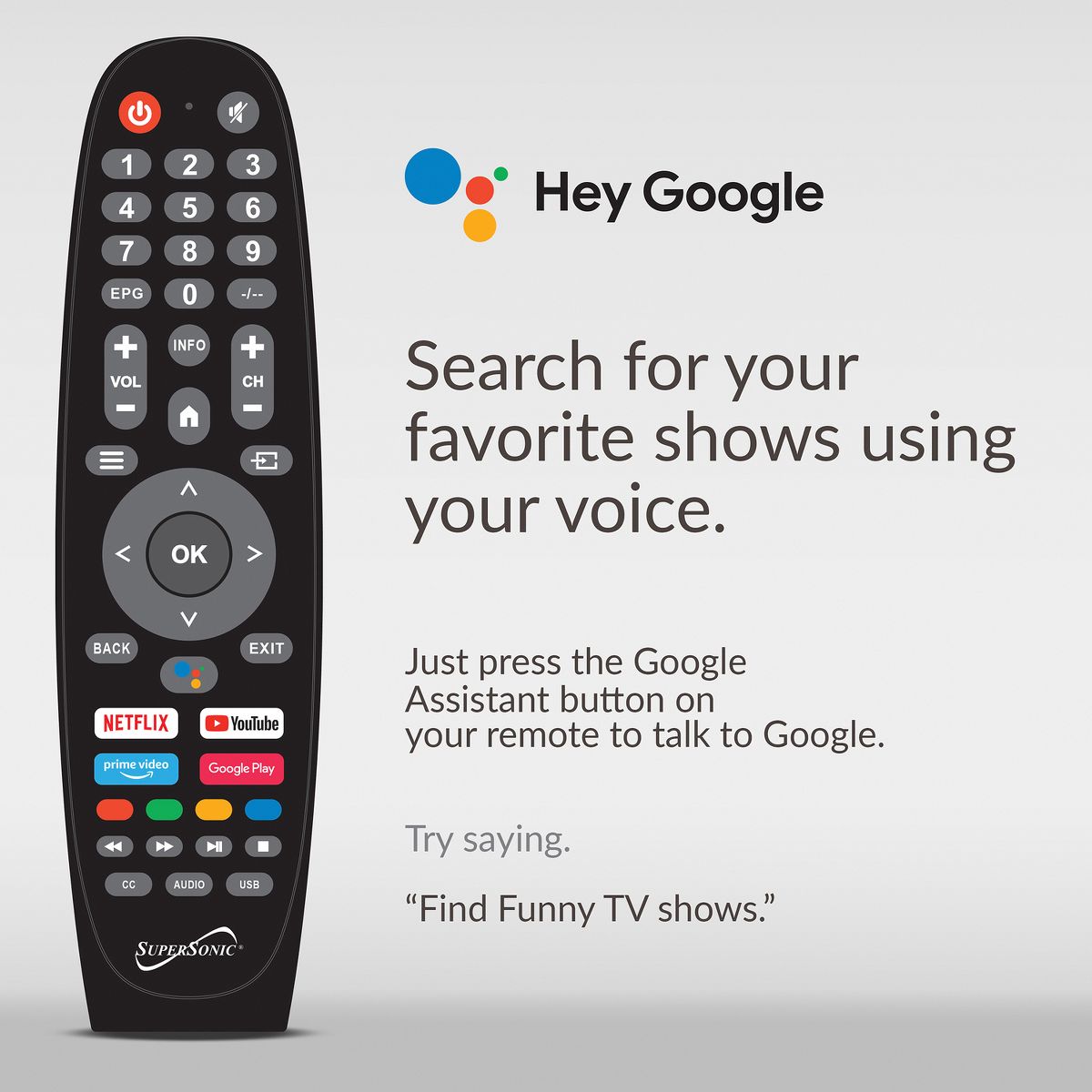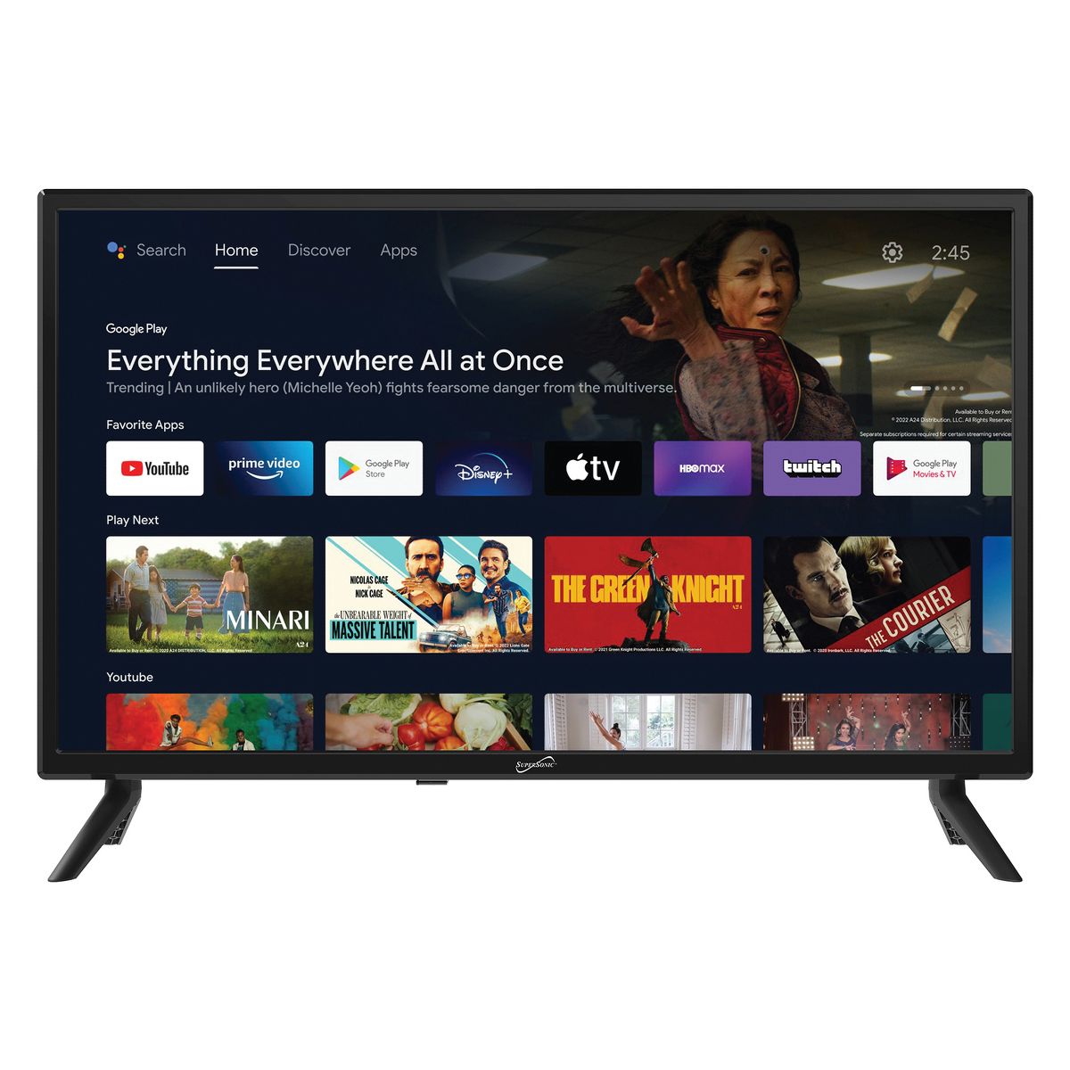 Upgrade your viewing experience with the Supersonic® SC-2450GTV 24-In. LED Smart HDTV. Immerse yourself in stunning HD visuals and smart features that elevate your entertainment to the next level. Featuring a 24-in. DLED HD display, this smart TV delivers crisp and clear images with vibrant colors. With built-in Google Assistant™, easily control your TV and access a world of content with just your voice. Enjoy seamless connectivity with HDMI® input compatibility and built-in Wi-Fi®, allowing you to stream your favorite shows, movies, and music effortlessly. The built-in USB input lets you enjoy pictures and music from a flash drive, adding versatility to your entertainment options. With a sleek design and anti-glare coating, the SC-2450GTV enhances any space while reducing glare for optimal viewing. Customize your viewing and listening experience with various picture and sound modes, including Standard, Vivid, Sports, Movie, Music, and more. Complete with a sleep timer function, multi-language on-screen display, and full-function remote control, the Supersonic SC-2450GTV offers convenience and flexibility. Whether you're at home or on the go, enjoy high-quality entertainment with this AC/DC-compatible smart TV.