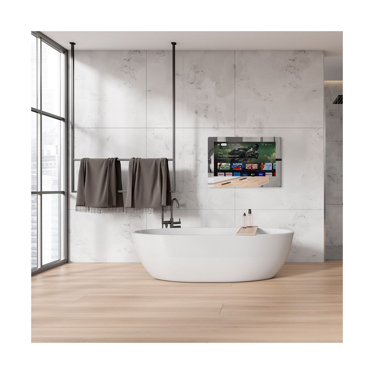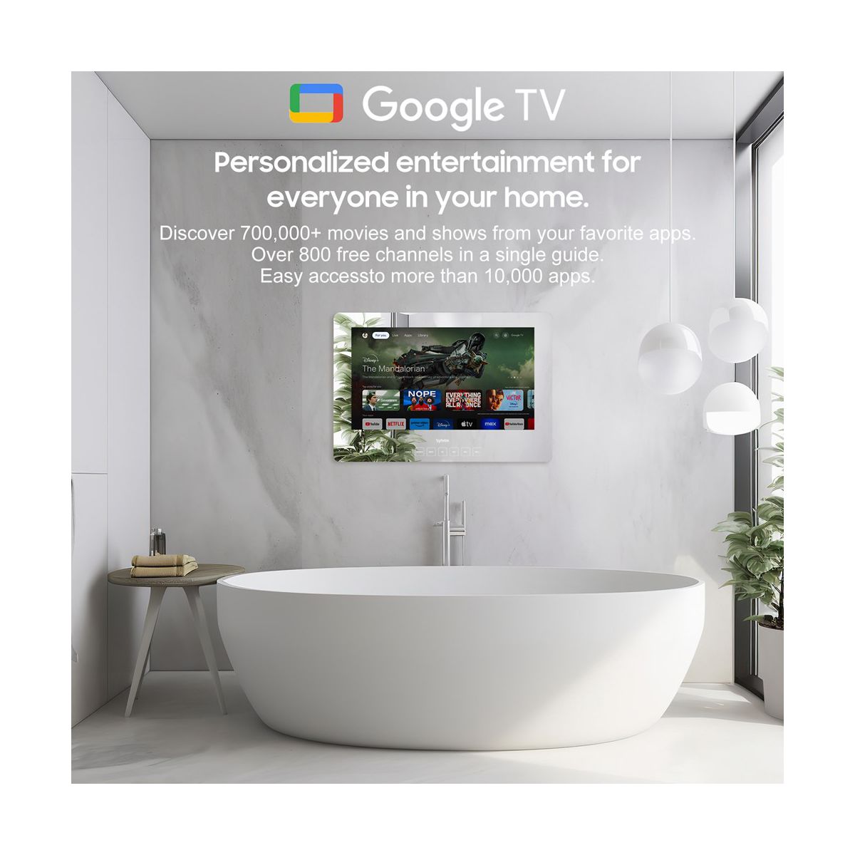 SYLVOX 24" Smart Mirror Bathroom TV features Google TV system, bringing voice control and smart home integration right to your bathroom. With 1080P HD resolution, IP65 waterproof design, and 500nit brightness, it's perfect for clear, crisp viewing even in steamy showers. Enjoy seamless WiFi & Bluetooth connectivity and touch button controls for a smart, functional upgrade.