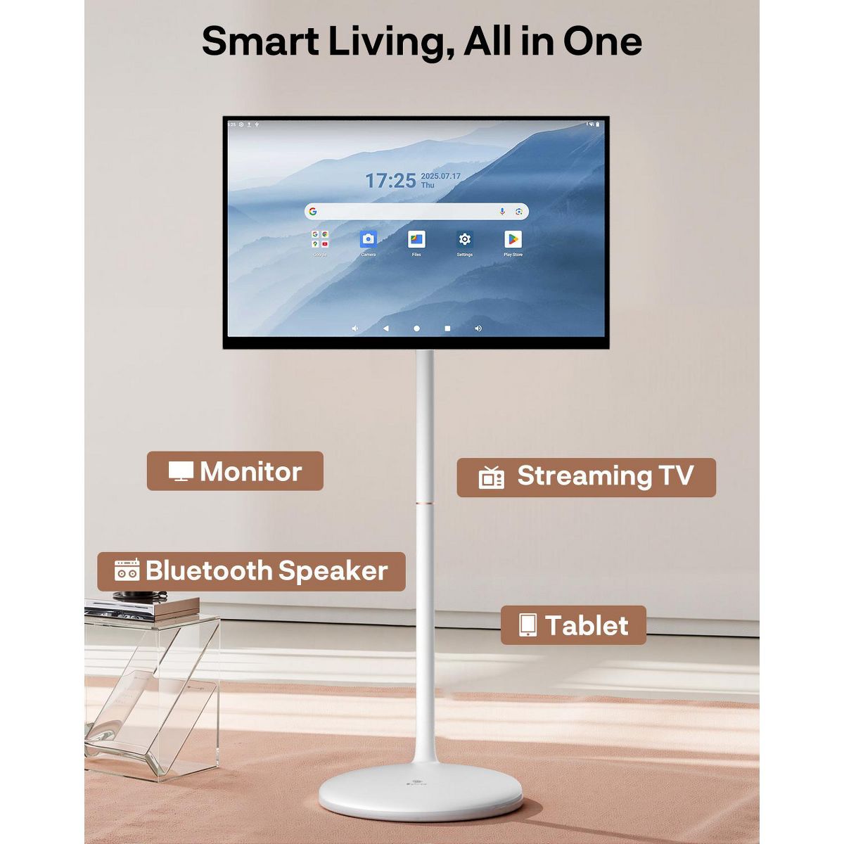 SYLVOX 27" Rolling Smart TV, 1080p Touchscreen, Android 14, 8GB+128GB, 10000mAh Battery, Voice Remote, Dual 10W Speakers, White