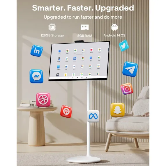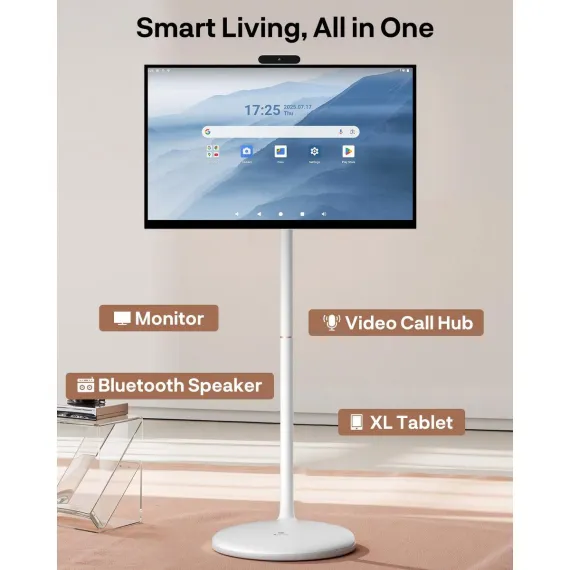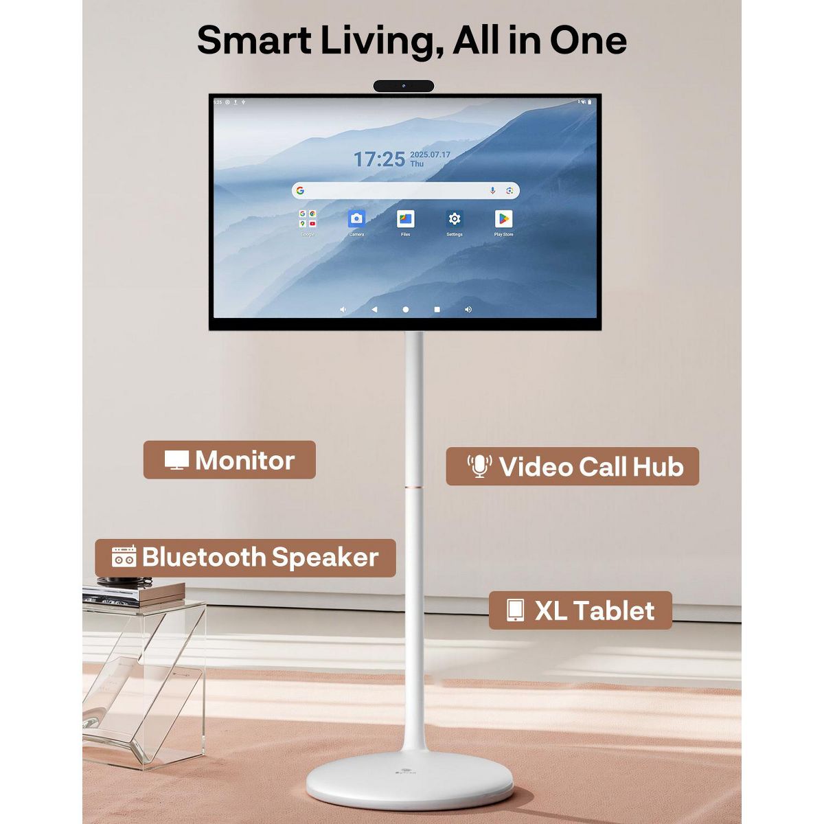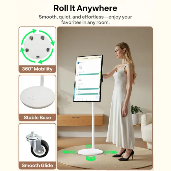 SYLVOX 32" Rolling TV with Camera, Large Tablet on Wheel, 1080p TouchScreen, 10000mAh Battery, Voice Remote, Dual 10W Speakers, Full Swivel, White