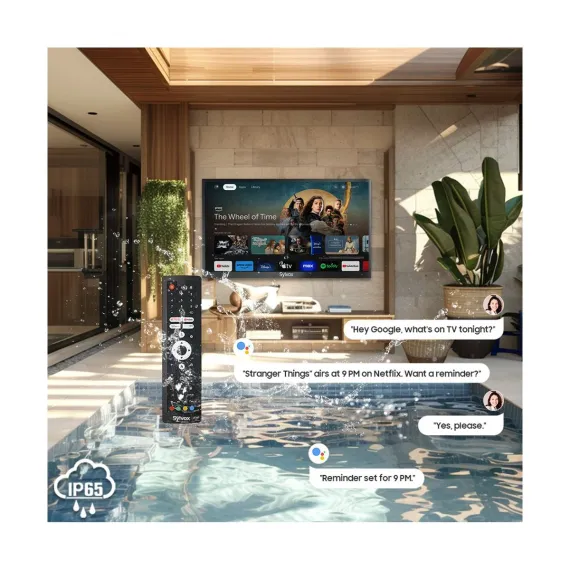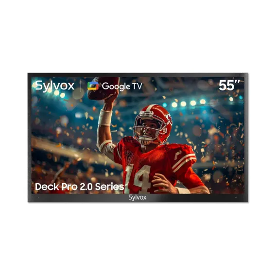The SYLVOX Deck Pro 2.0 series of outdoor TVs with Google OS provides a smooth and intuitive user experience. With Google Voice Assistant and the included Voice Remote, or compatible Alexa, you can enjoy your favorite content with simple commands. The built-in Google Play Store lets you download all kinds of apps at your leisure, and the Chromecast feature makes it easy to project content from your mobile device or computer to your TV screen, while supporting convenient connectivity with home Wi-Fi and Bluetooth devices. The Smart Outdoor TV is equipped with 4K Ultra HD resolution to display a detailed picture; support for HDR and up to 1000nits brightness ensures that you can enjoy a full color and realistic visual experience during the daytime.IP55 waterproof rating, with excellent waterproof, windproof and dustproof characteristics, adapts to a variety of outdoor environments. The TV adopts an aluminum alloy body and is covered with a special metallic paint to achieve excellent dust, corrosion and scratch resistance.