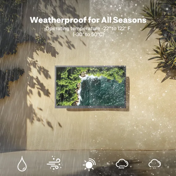 The Sylvox 32" Outdoor TV features 1500-nit brightness, ensuring vivid visuals even in direct sunlight. Powered by Google TV, it offers seamless streaming with Google Assistant and Chromecast built-in. Built for durability, it has an IP55 waterproof rating and a scratch-proof full-metal shell, operating in extreme temperatures from -30℃ to 50℃ (-22℉ to 122℉). The 3-in-1 voice remote and dual-band Wi-Fi ensure effortless control and smooth streaming, making it the perfect outdoor entertainment solution.