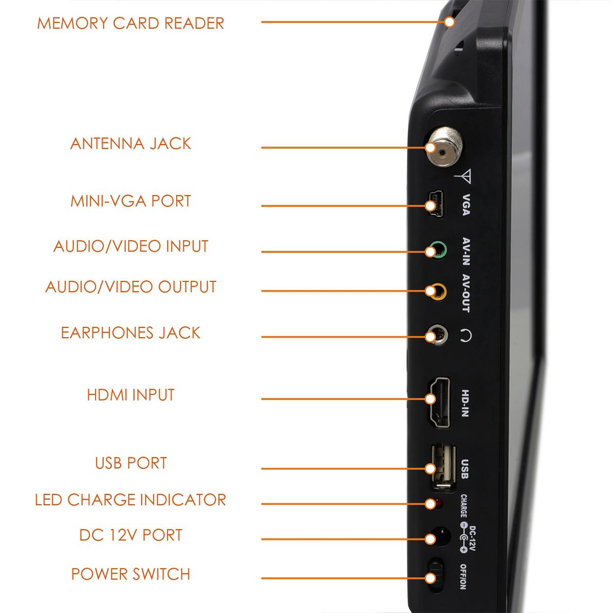 The Trexonic Portable Rechargeable 14" LED TV with HDMI, SD/MMC, USB, VGA, AV In/Out and Built-in Digital Tuner offers you the luxury of high-quality entertainment on the go! The unit comes with an included wall charger as well as a car charger for easy charging on the go. With the included Remote Control, you can relax and control your new television without having to leave your seat. With the included Detachable Telescope Antenna, you can catch local channels and enjoy entertainment without streaming content from any other device or digital storage.