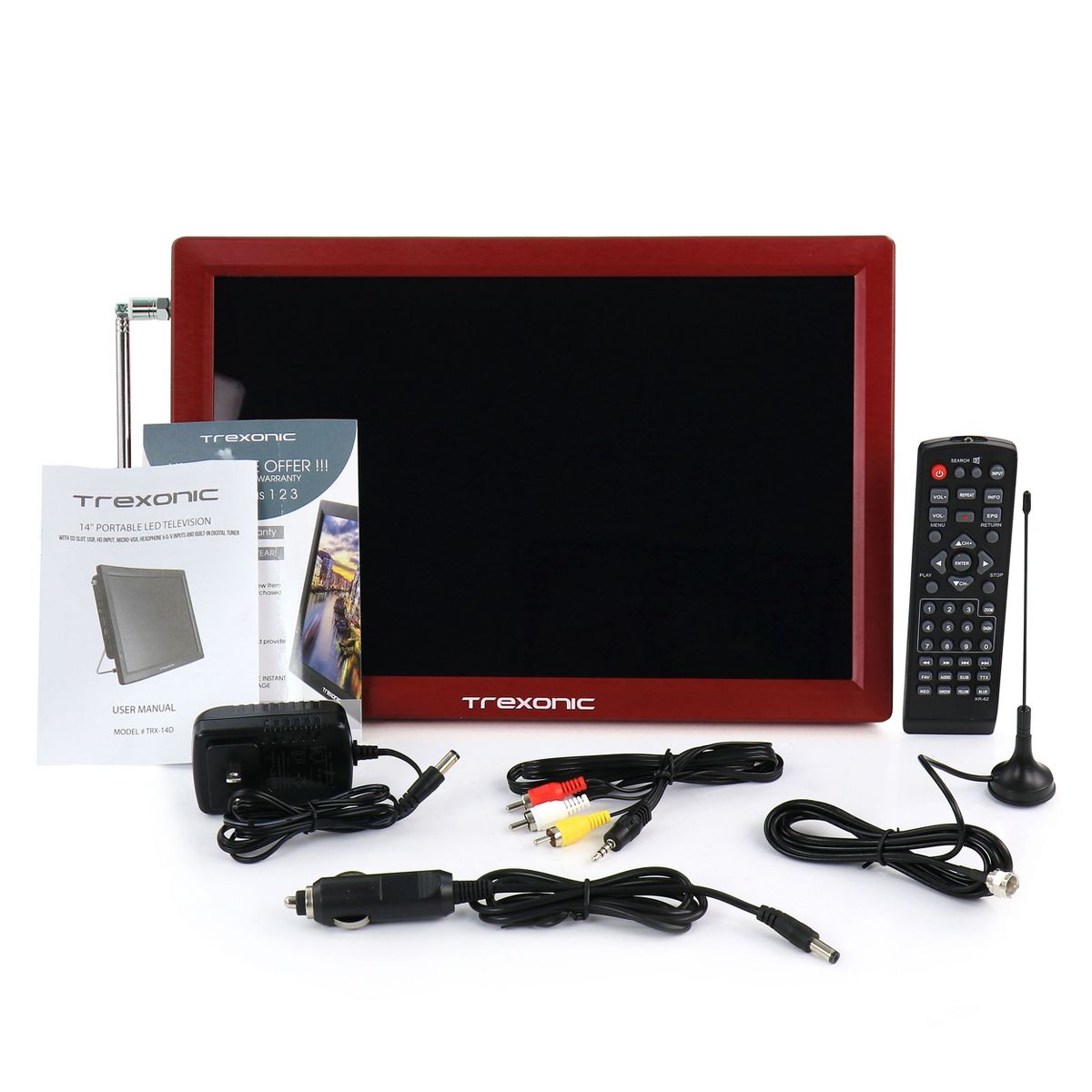 The Trexonic Portable Rechargeable 14” LED TV with HDMI, SD/MMC, USB, VGA, AV In/Out and Built-in Digital Tuner offers you the luxury of high-quality entertainment on the go! The unit comes with an included wall charger as well as a car charger for easy charging on the go. With the included Remote Control, you can relax and control your new television without having to leave your seat. With the included Detachable Telescope Antenna, you can catch local channels and enjoy entertainment without streaming content from any other device or digital storage.