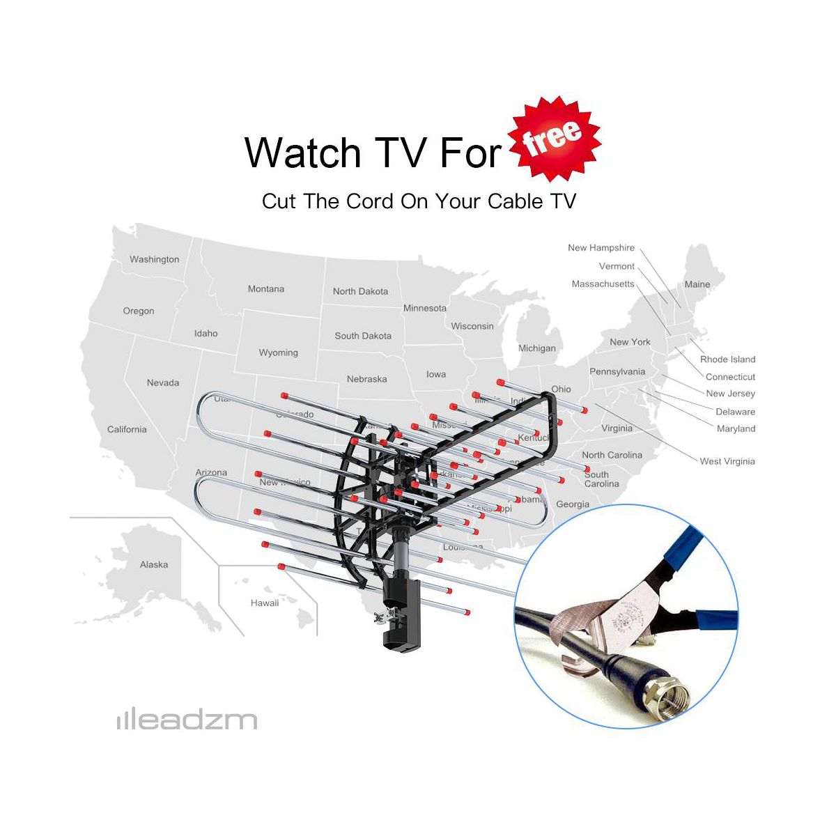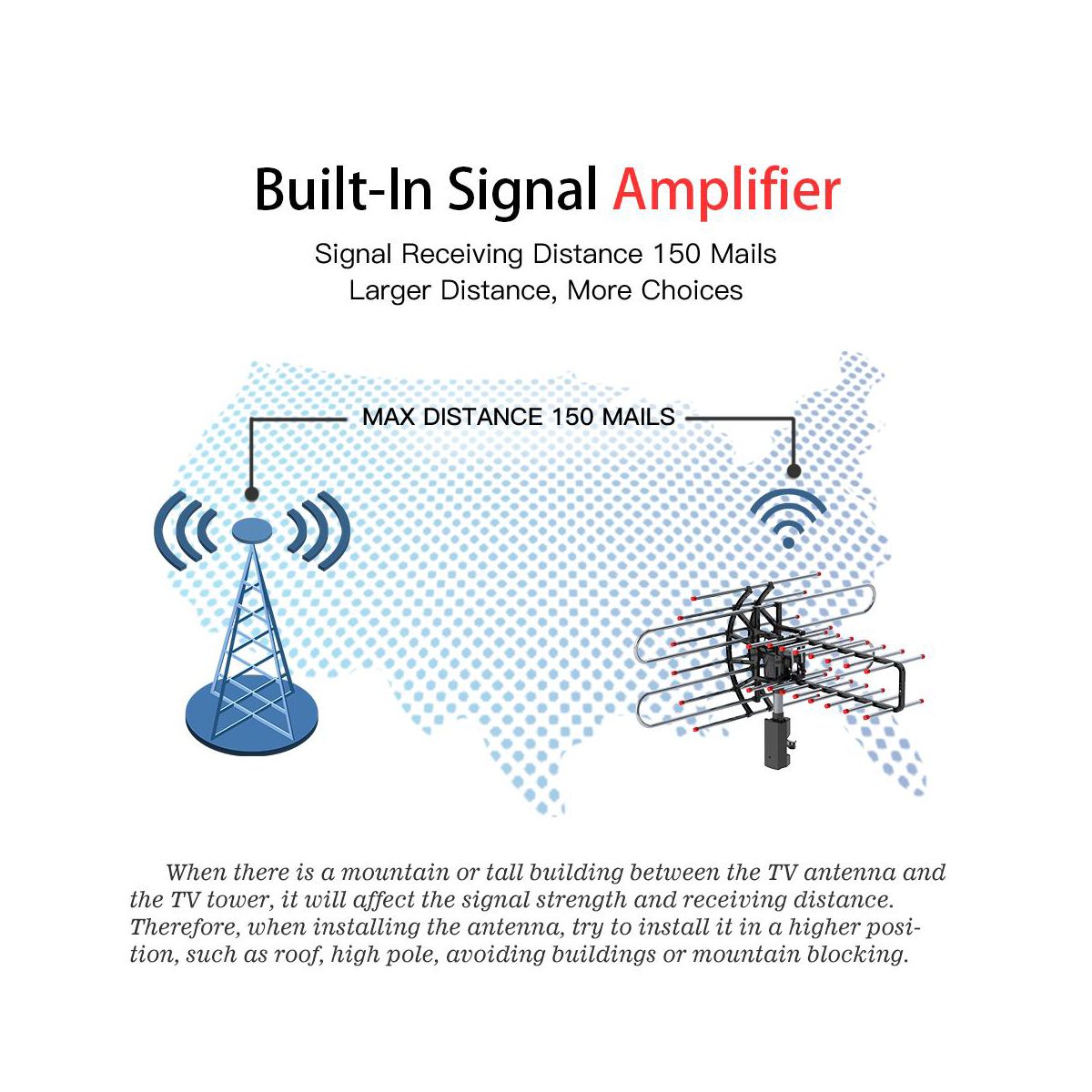Free channel for life! Built-in high gain booster and low noise amplifier, our HDTV antenna can receive digital HDTV UHF/VHF signals within 150 miles while providing 1080P HD picture. With it, you can enjoy many high quality TV channels free. And equipped with 360 degree motorized rotation system, our HDTV antenna can rotate itself all-around to capture the best signals through the remote control on your hands. Coming with around 42.65ft long cable, our HDTV antenna can be put on your roof more easily to get the best signal. Additionally, owning dual output ports, our HDTV antenna can support two TVs at the same time.