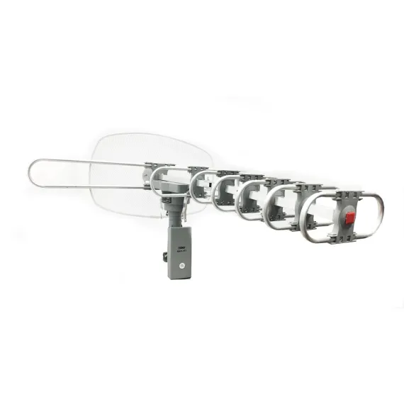 This high-powered amplified motorized outdoor at SC digital TV antenna from Naxa rotates 350 degrees to optimize the reception of any station. Rotate the antenna from the comfort of your living room with the included remote control. Its large size improves reception, picture, and sound quality while maintaining a slim and modern profile, and it’s compatible with UHF, VHF, and FM signals. A wireless remote control, easy installation bracket, coaxial cable, plastic safety ties, and cable straps are included.