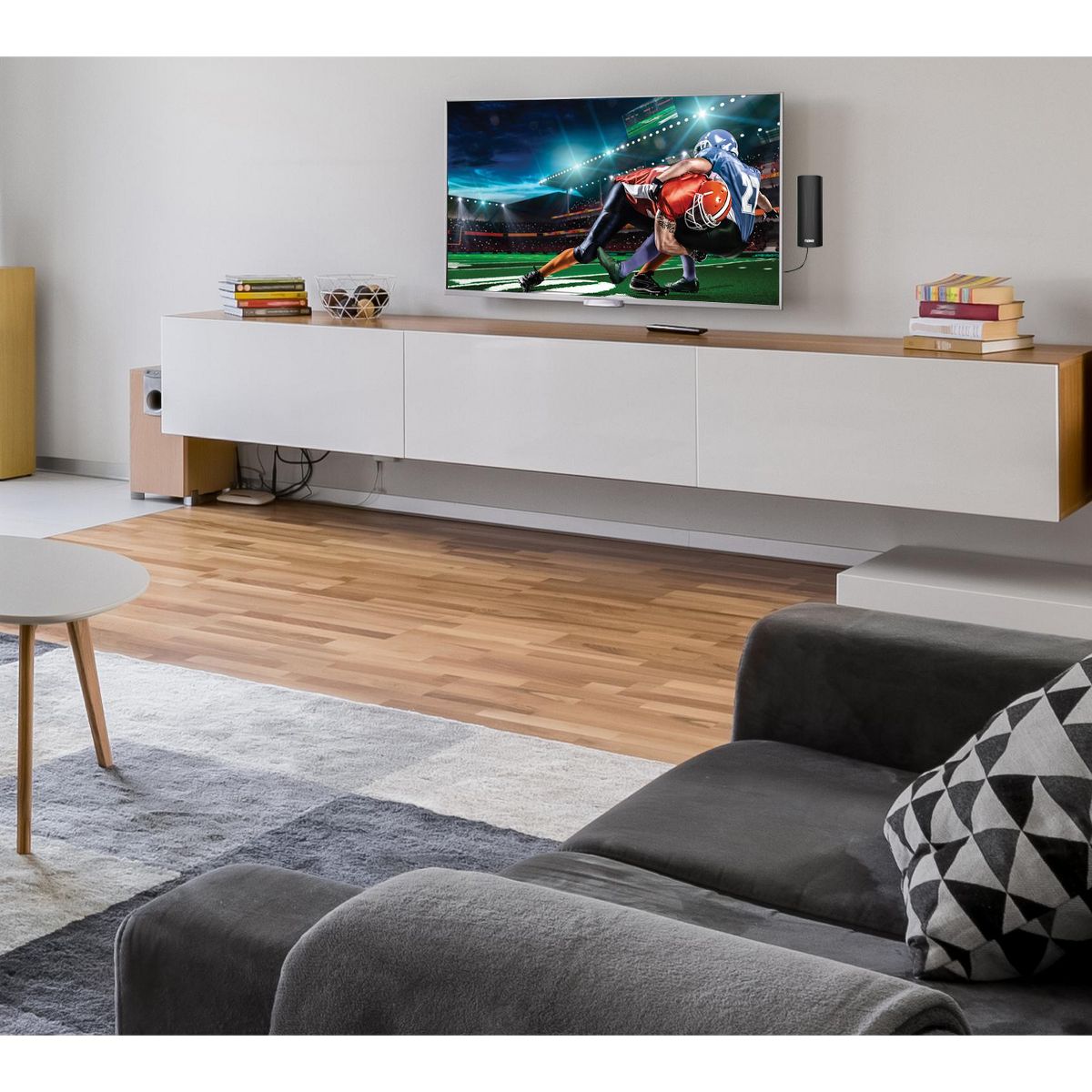 Improve reception with this high powered amplified motorized outdoor antenna suitable for HDTV and ATSC digital television. Amplified HDTV Digital Antenna, Slim Modern Design, Motorized 360 Degrees Rotating Antenna, Large Sized for Improved Reception, Picture and Sound Quality, Frequency Compatibility: UHF/VHF/FM, Frequency Range: VHF: 40-230MHz; UHF 470-862MHz, Bracket Included for Easy Installation, Coaxial Cable, Plastic Safety, Ties & Cable Straps Included.
