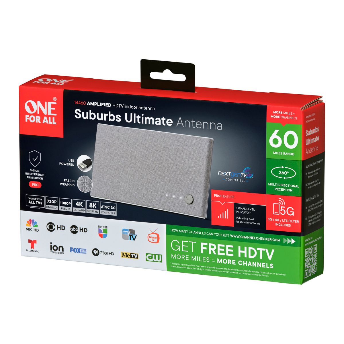 Get excellent reception of digital TV with this Amplified HDTV Indoor Antenna from One For All®. It is compatible with free digital over-the-air (OTA) programs broadcast in Full HD up to 8K! Enjoy a crystal clear reception thanks to its 3G/4G/5G block-filter that shields all mobile phone signals. Following a modern yet practical design, the antenna can be placed flat, standing, or wall mounted. Its multi-directional technology helps with the reception. This antenna is powered directly via the USB port of your TV or STB. It has simple installation thanks to the quick setup guide included in the packaging. It is recommend to use this antenna within a range of 60 miles from your nearest transmitter._