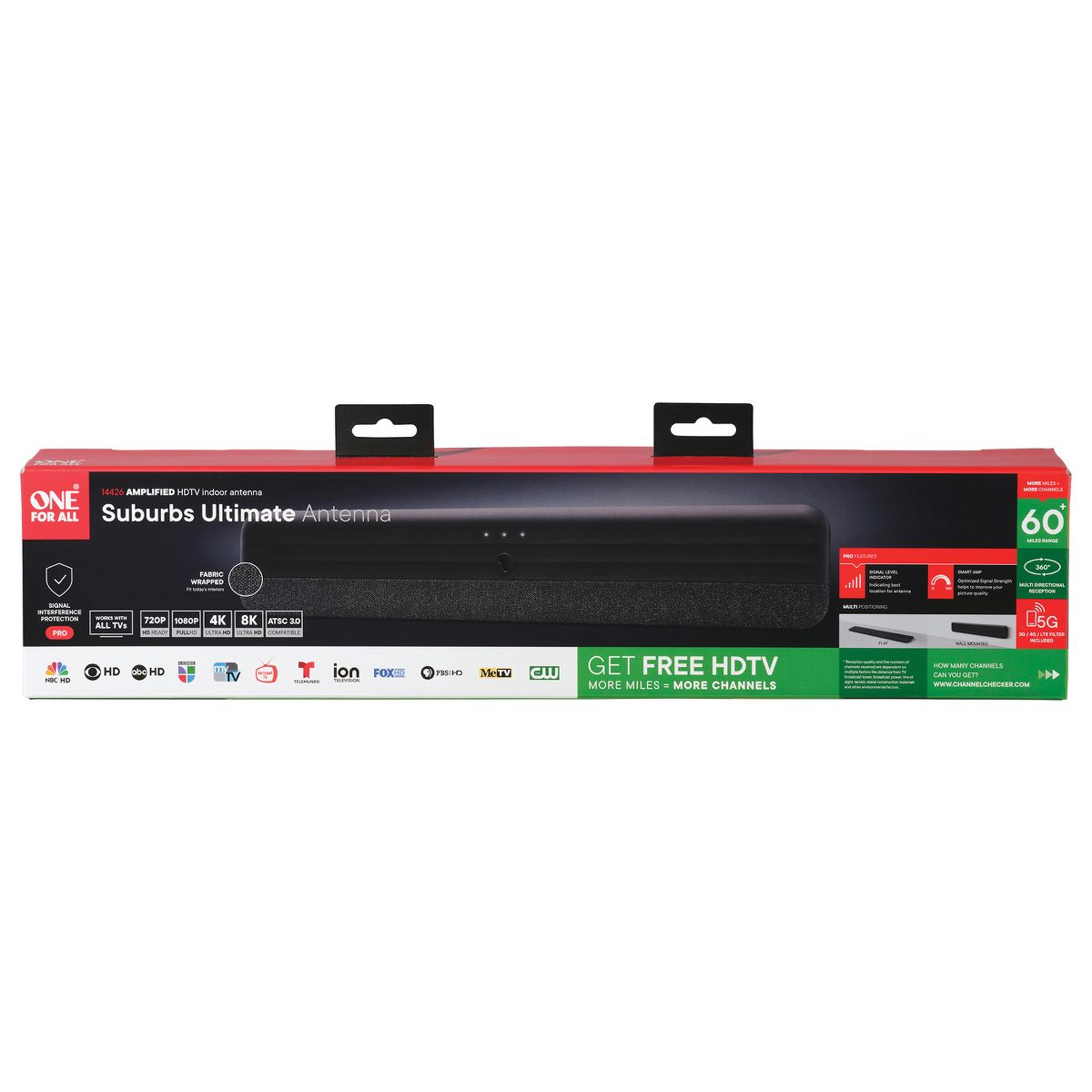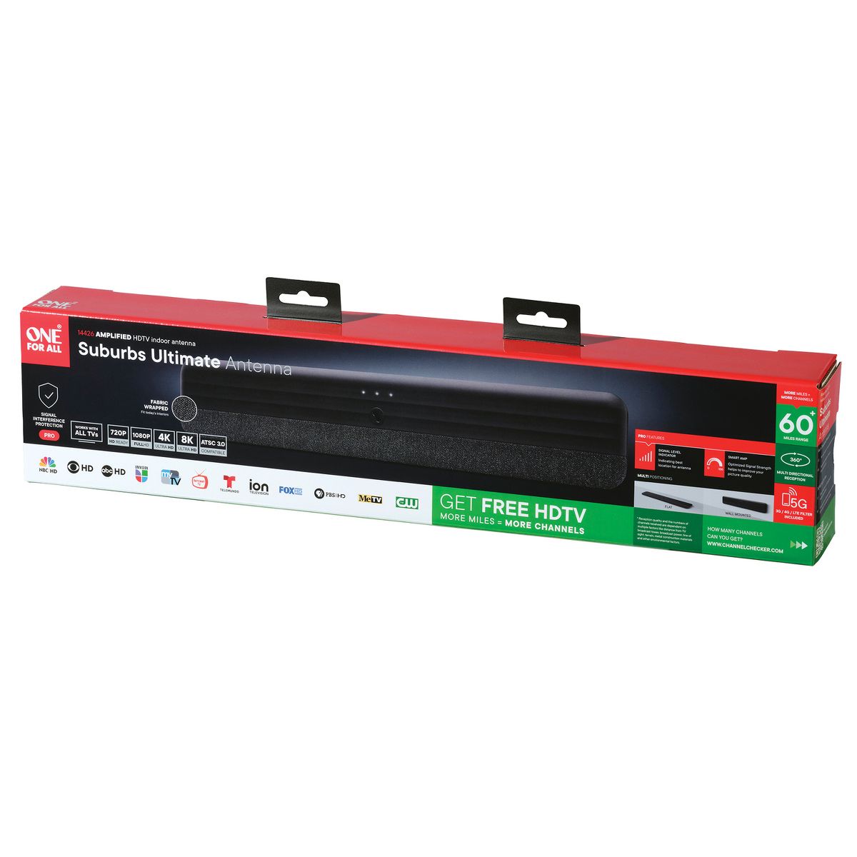 Enjoy free 1080p and 4K broadcast TV without having to pay expensive cable fees. With One for All's Amplified Fabric Indoor TV Antenna, enjoy a wide variety of channels such as news, sports, comedy, kids and many more! This antenna has a reception range up to 60 miles with a black fabric panel and variable gain control. It's compatible with ATSC 3.0 (NextGen TV) to receive 4K Ultra HDTV with movie-quality sound and more (requires TV with NextGen capabilities). It even includes a signal level indicator so you know how strong your signal is._