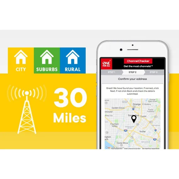 Get the best reception possible of free digital over-the-air (OTA) TV broadcasts and enjoy a wide variety of free channels such as news, sports, comedy, kids, and many more with the One For All® Indoor Digital Antenna. This antenna has a reception range of up to 30 miles. Its multi-directional technology helps with the reception of more channels, avoiding blind spots and its ultra-thin profile help it fit into any location._