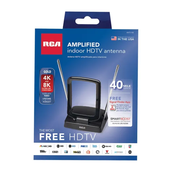 This small but powerful RCA ANT310E Indoor Amplified TV and FM Antenna is the ideal addition to your entertainment center to allow you to pick up all your local TV and radio stations for free. Proven to receive signals from over 40 miles, you will have plenty of stations from which to choose. It is designed with a flat-panel UHF element to boost channels from 14-69 while dipoles adjust to strengthen signals from channels 2-13. Utilizing Smartboost technology that amplifies weak signals and filters out noise, rest assured you will have the best entertaining experience with many channels to surf._