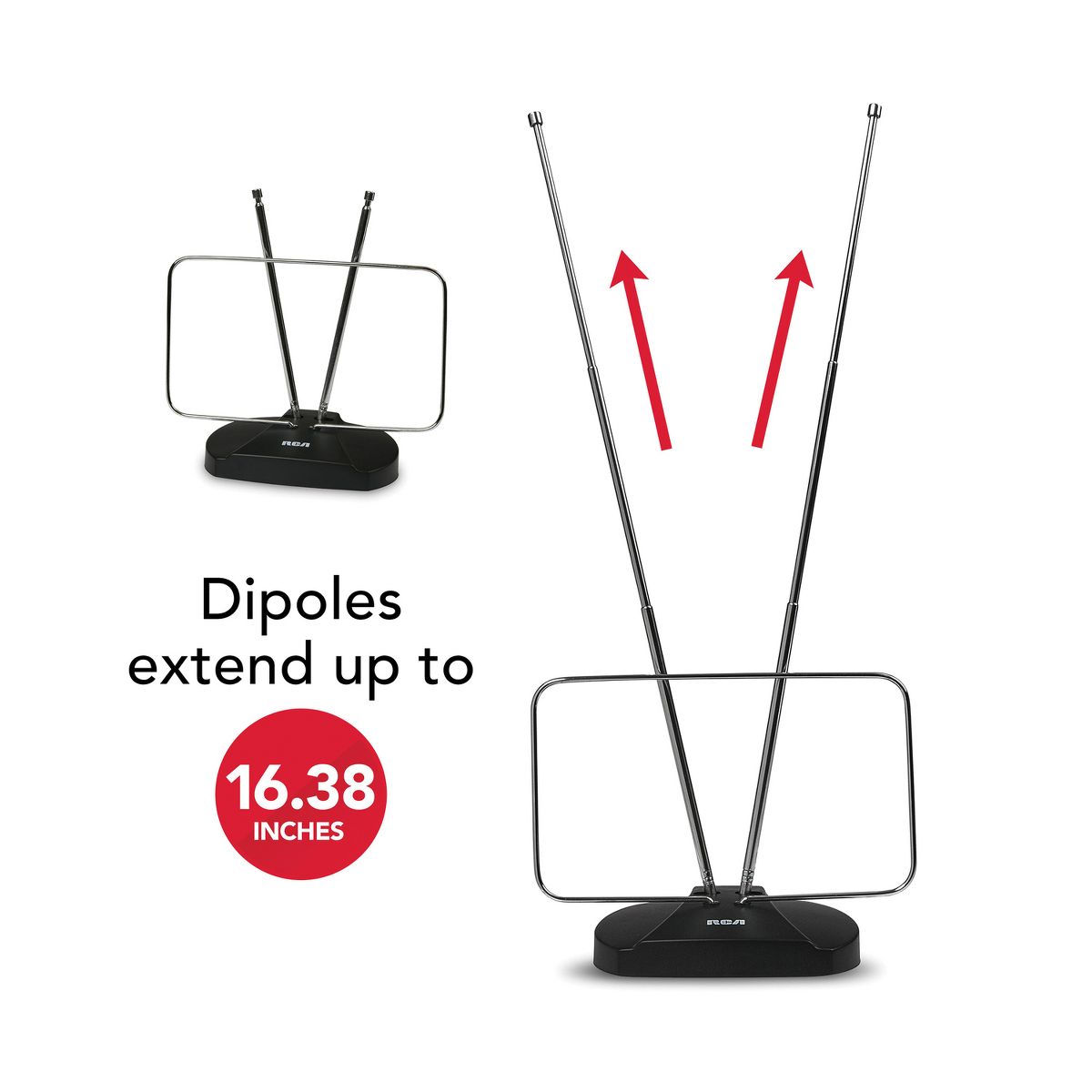 Keep it simple and enjoy uncompressed broadcast TV reception with the RCA ANT111E Indoor FM and HDTV Antenna. It provides free off-air reception of local digital channels and can handle 1080 and 4K broadcast signals, making it a great complement to streaming players. It has adjustable and retractable VHF dipoles and a UHF loop that improve reception of stations up to 40 miles away. The no-scuff pad on its base protects your cabinet or top of the TV._
