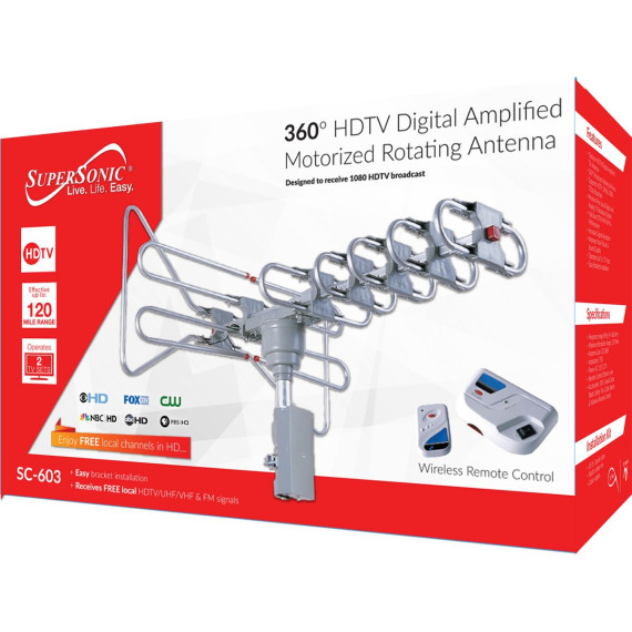 If terrain or distance is an issue, go high and go outdoors! Cut the cord on cable and satellite with this Supersonic SC-603 360° HDTV Digital Amplified Motorized Rotating Outdoor Antenna! It lets you receive your local news, weather, sitcoms, kids and sports programming for free! Boost your signal strength and enjoy clear, crisp picture quality and free TV with this outdoor antenna._