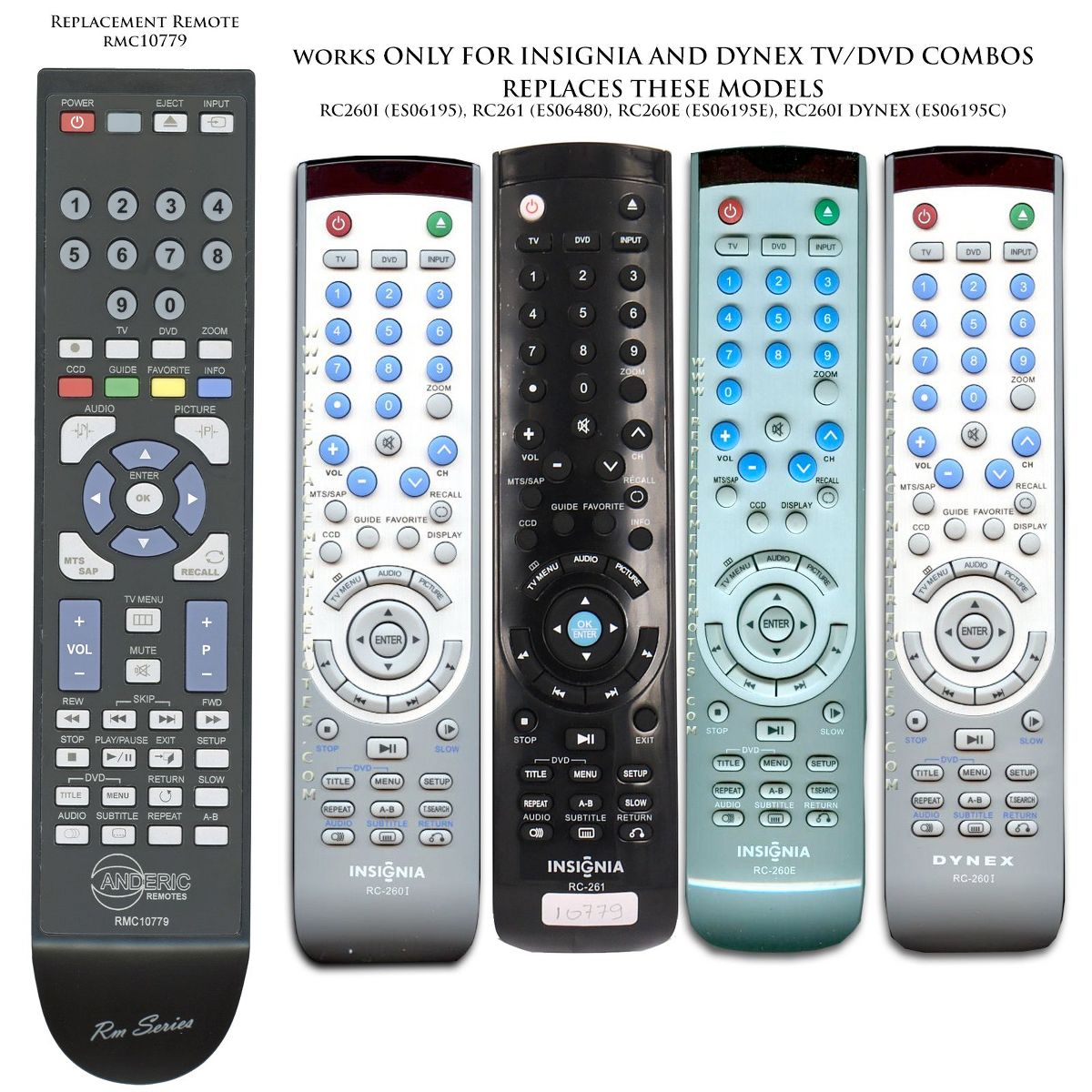 The Anderic RRC260 remote control (also known as RMD10779 or RMC10779) is a direct replacement for several original Insignia and Dynex TV/DVD Combo remotes, including RC-260D, RC-260E, RC-260I, and RC-261. Designed to function exactly like the original remote, the RRC260 requires no programming—just insert batteries and start controlling your TV/DVD combo instantly. This pre-programmed remote offers full functionality, including all standard TV controls along with GUIDE, MENU, INFO, and INPUT buttons for easy navigation and playback.