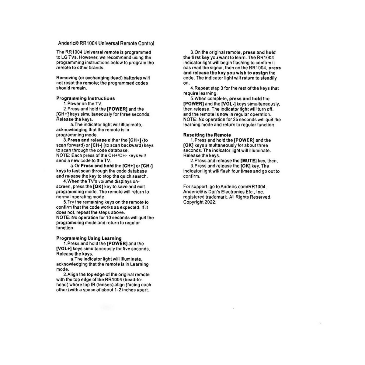 With a limited-key layout, the RR1004 includes only essential buttons: Power, Channel Up/Down, Volume Up/Down, Mute, and Closed Captioning. This reduces confusion by eliminating unnecessary features found on standard remotes. Its infrared learning capability lets you customize any key to match your original remote’s functions—such as setting a button to open streaming apps like Netflix. The RR1004’s hassle-free design and clear operating manual make it a reliable and user-friendly solution for nearly any television setup.