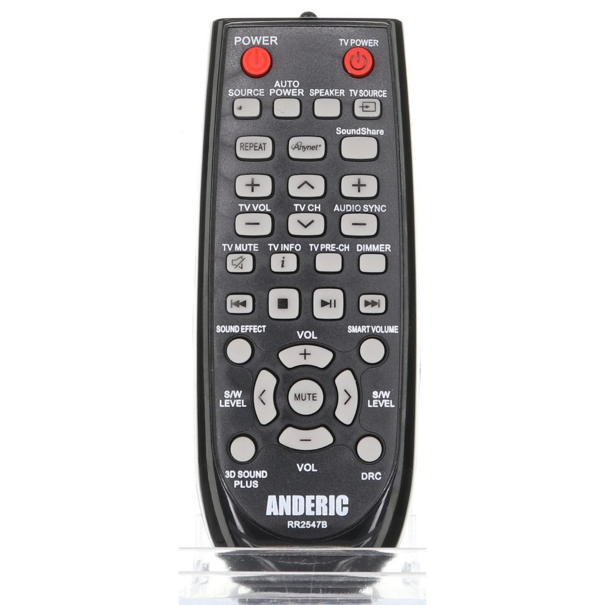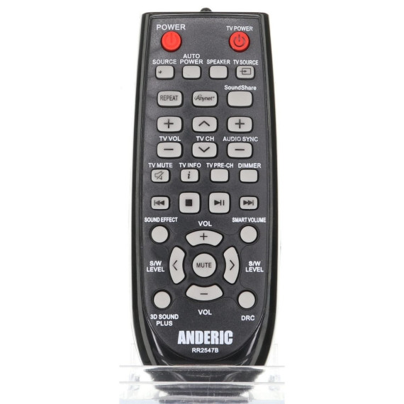 The Anderic RR2547B remote control is a simple, pre-programmed replacement for many original Samsung Audio Sound Bar System remotes. Designed to work immediately with compatible Samsung sound systems, this remote requires no setup or programming. It includes familiar functions such as Anynet and Source, along with other essential audio control buttons.