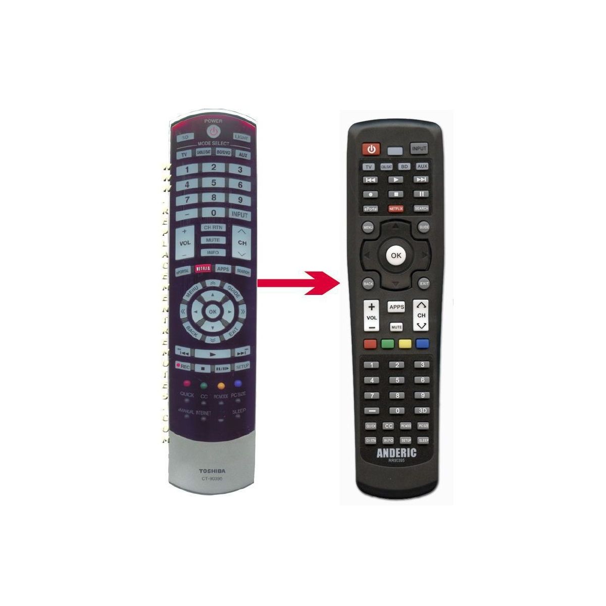 The Anderic RR90395 remote control is a direct replacement for a wide range of original Toshiba TV remotes, including models like CT90395, CT90302, CT90427, and others. Pre-programmed for Toshiba HDTVs, this remote requires no setup—just insert the batteries and it’s ready to use.