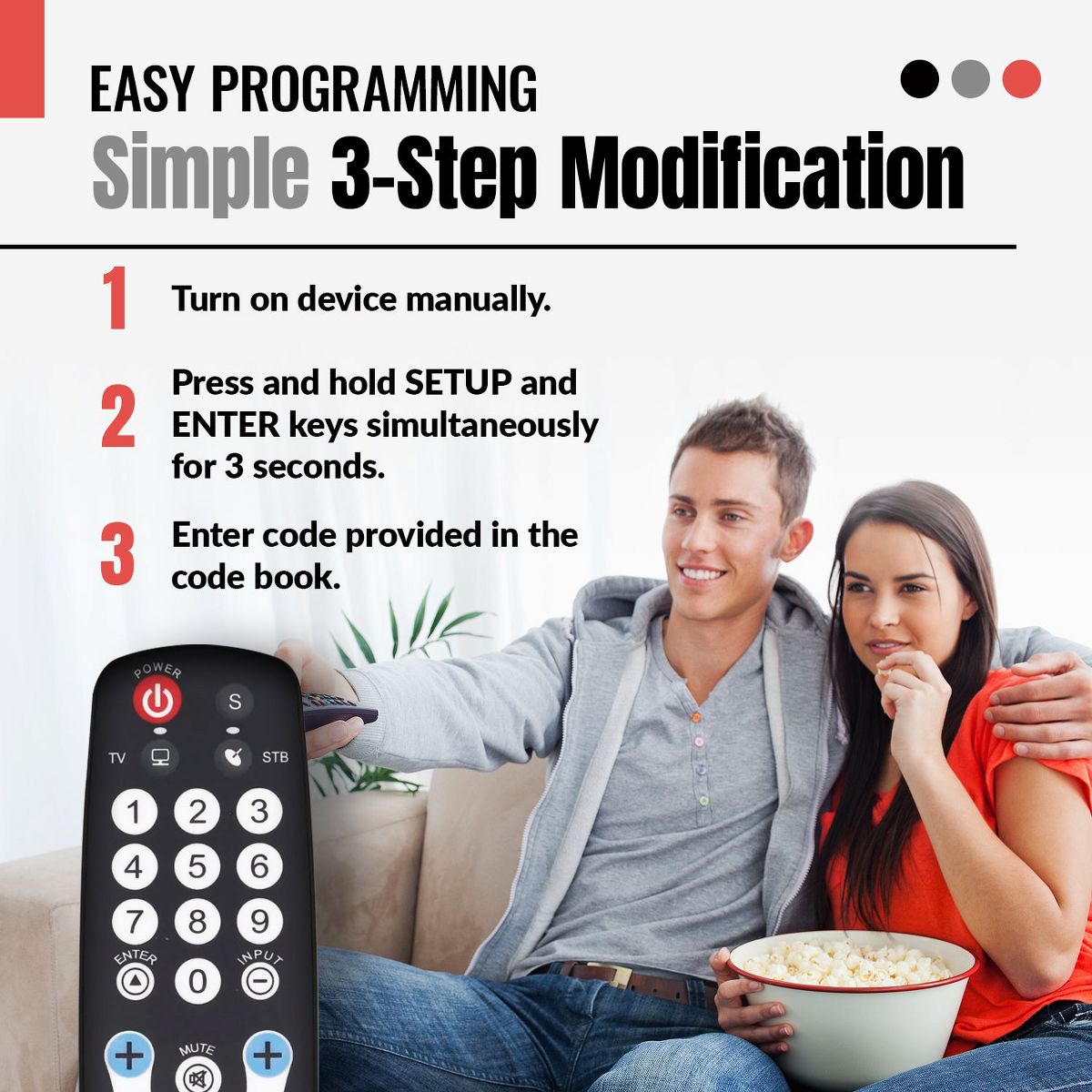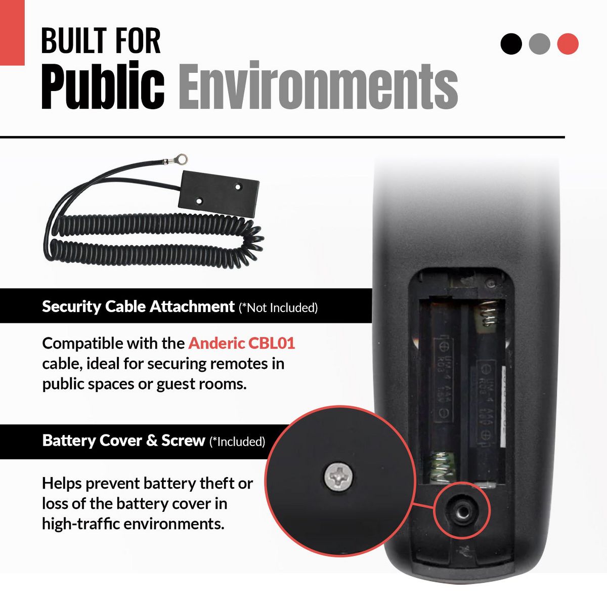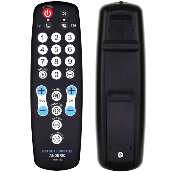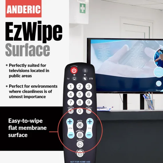 The Anderic RRHC100 EzWipe is a hospitality-grade remote control designed for clean, simplified operation in hotels, healthcare facilities, and other high-traffic environments. Featuring a sealed flat membrane surface, the RRHC100 is easy to sanitize between guests—just wipe and go. It comes pre-programmed for LG and Vizio TVs, with optional setup for two-device use (TV + cable/satellite box) and intuitive auto-switching between TV and STB functions. Engineered for guest convenience and property security, the RRHC100 eliminates unnecessary buttons, includes glow-in-the-dark volume and channel keys, and offers compatibility with optional security accessories like the CBL01 cable and a locking battery cover. Setup is fast via direct code entry or auto-search, and punch-through programming ensures seamless control of multiple devices with minimal button confusion.