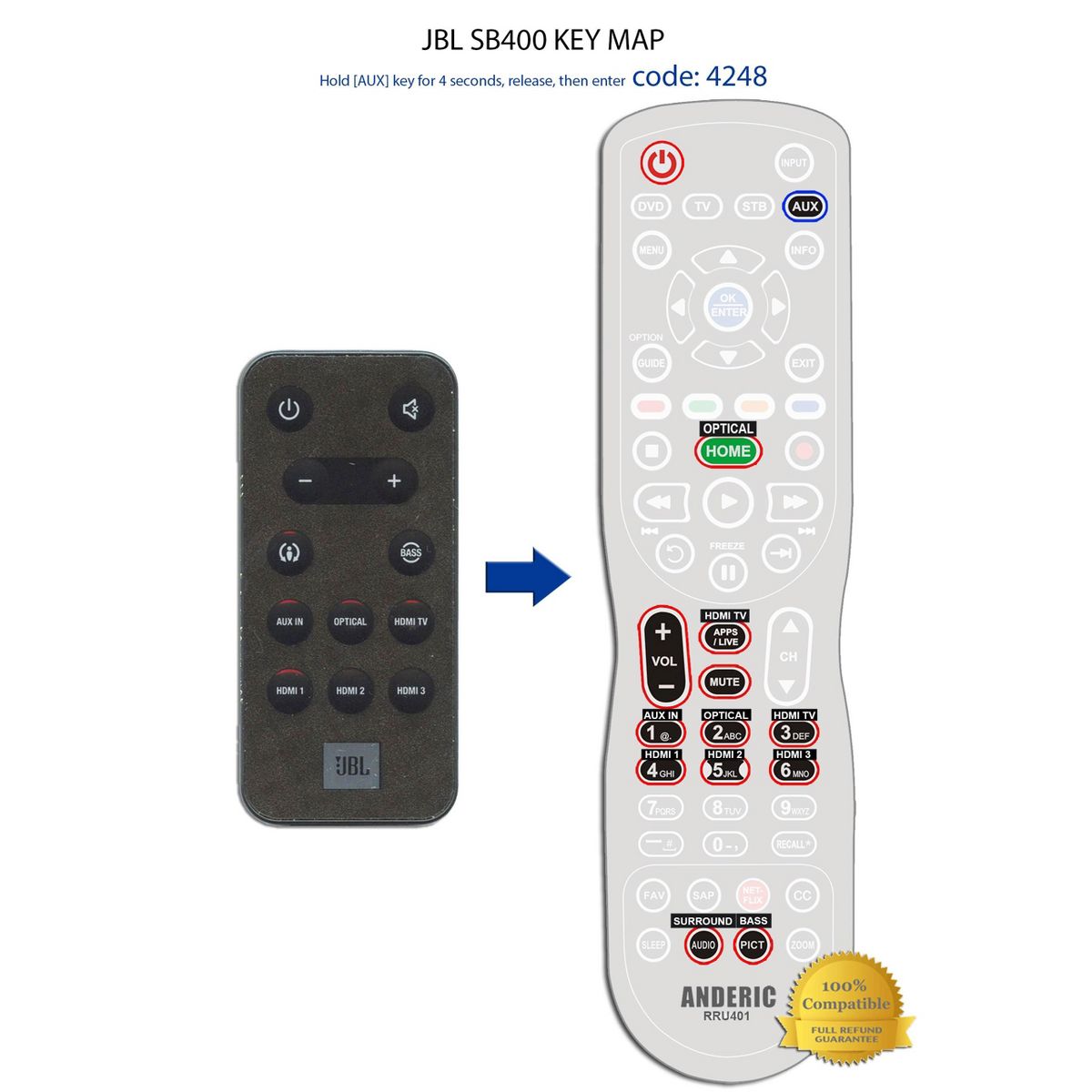 The Anderic RRSB400 remote control is a direct replacement for the original JBL SB400 sound bar remote. Designed for immediate use, this remote is pre-programmed and works right out of the package with compatible JBL audio systems—no setup required.