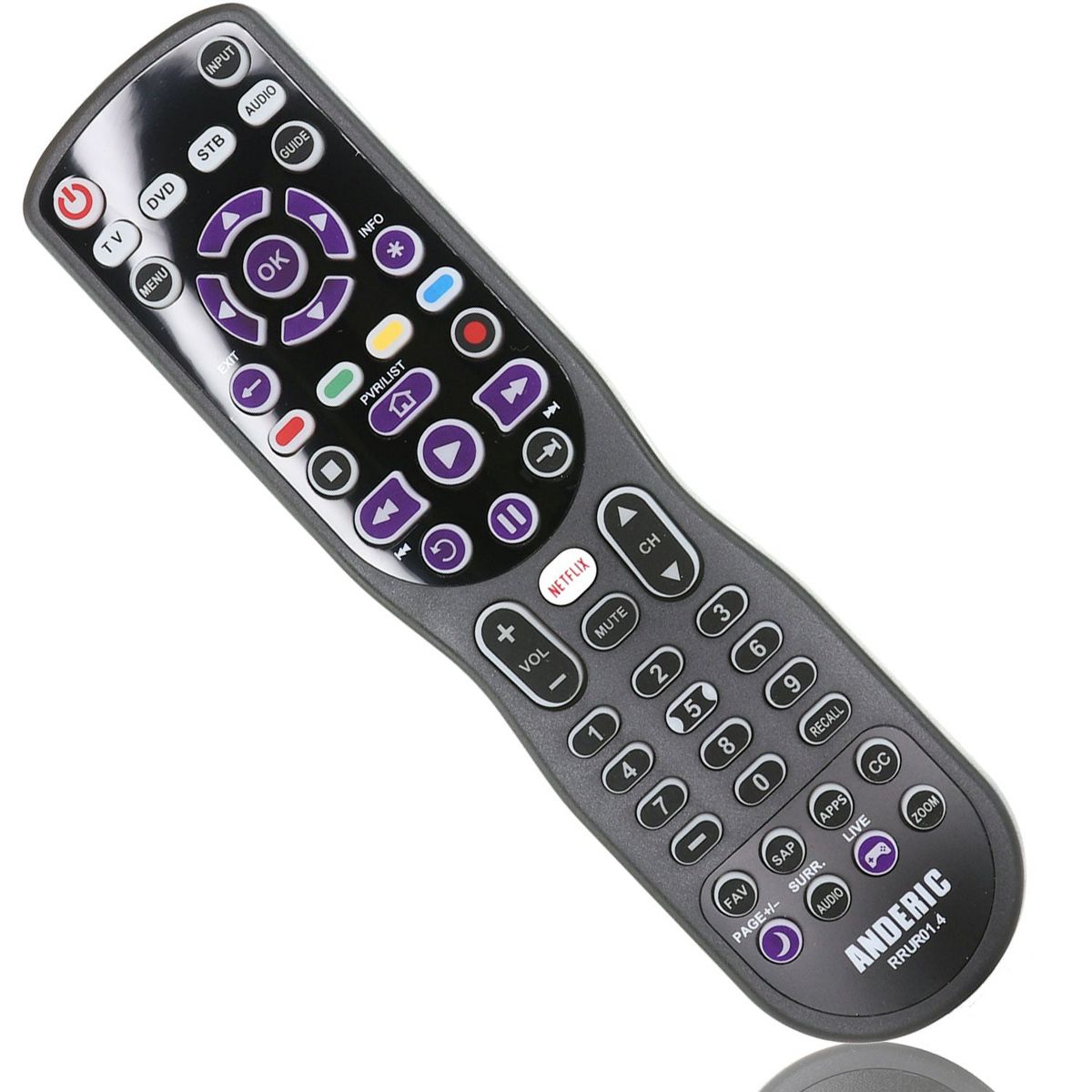 The Anderic RRUR01 is a 4-device universal remote designed to control all Roku Streaming Players and Insignia Roku TVs via infrared (IR) line-of-sight. Pre-programmed for Roku devices, it can also be easily set up to control most TVs, soundbars, A/V receivers, and set-top boxes such as cable and satellite receivers. Compatible with Roku-enhanced TVs from brands like TCL, Hisense, Sharp, Philips, LG, and more (with one-time programming), the RRUR01 helps streamline your entertainment system.