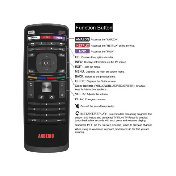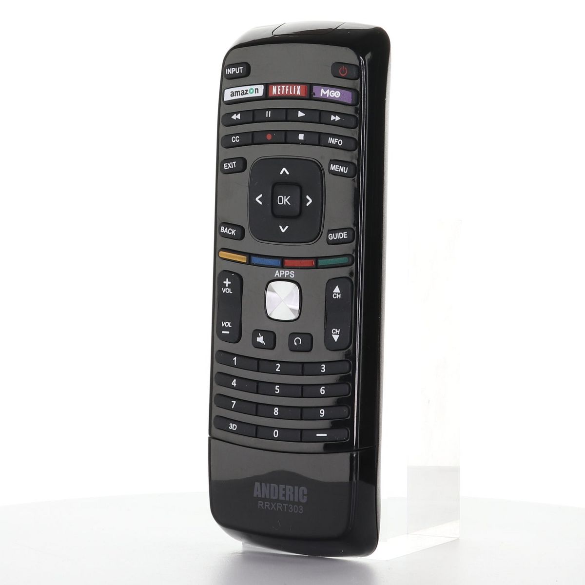 The Anderic RRXRT303 remote control is a reliable, cost-effective replacement for the original Vizio XRT303 and other compatible Vizio remotes. With plug-and-play functionality, it requires no programming—just insert the batteries and it’s ready to use. Designed exclusively for Vizio TVs, this remote offers full access to your television’s features, including popular apps like NETFLIX, complete menu navigation, and input selection. What sets the RRXRT303 apart is its built-in QWERTY keyboard on the reverse side, allowing for quicker text input and easier browsing—even if your original TV remote didn’t include this feature. It replaces remotes such as VUR10 5.0 Bluetooth, VUR103D, XRT302, XRT301, XRV1TV3D, and XRT1TV using reliable infrared signals (note: Bluetooth is not supported). The remote is pre-programmed for Vizio HDTVs and does not support any other devices such as DVD players or cable boxes.