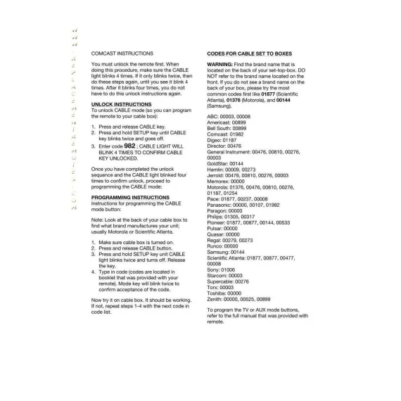This remote will program to work the following brand Cable box units: ABC, Americast, Bell South, Comcast, Cox, Digeo, Director, General Instrument, GoldStar, Hamlin, Jerrold, Memorex, Motorola, Pace, Panasonic, Paragon, Philips, Pioneer, Pulsar, Quasar, Regal, Runco, Samsung, Scientific Atlanta, Sony, Starcom, Supercable, Torx, Toshiba, Time Warner Cable, Zenith