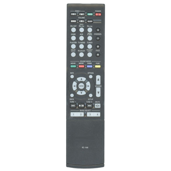 The RC-1189 remote control (30701016700AD) is an original IR remote designed for specific Denon A/V receivers. It provides easy operation of volume, inputs, tuner, and surround sound modes for seamless home theater control. No programming is required for the listed receivers.