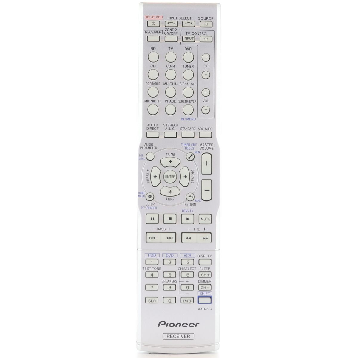 The Pioneer AXD7537 A/V Receiver Remote Control offers precise and reliable operation for your Pioneer AXD7537 receiver. Designed to seamlessly integrate with your audio-video setup, it provides intuitive control over volume, input selection, and sound modes, enhancing your home entertainment experience with expert-level convenience and functionality.